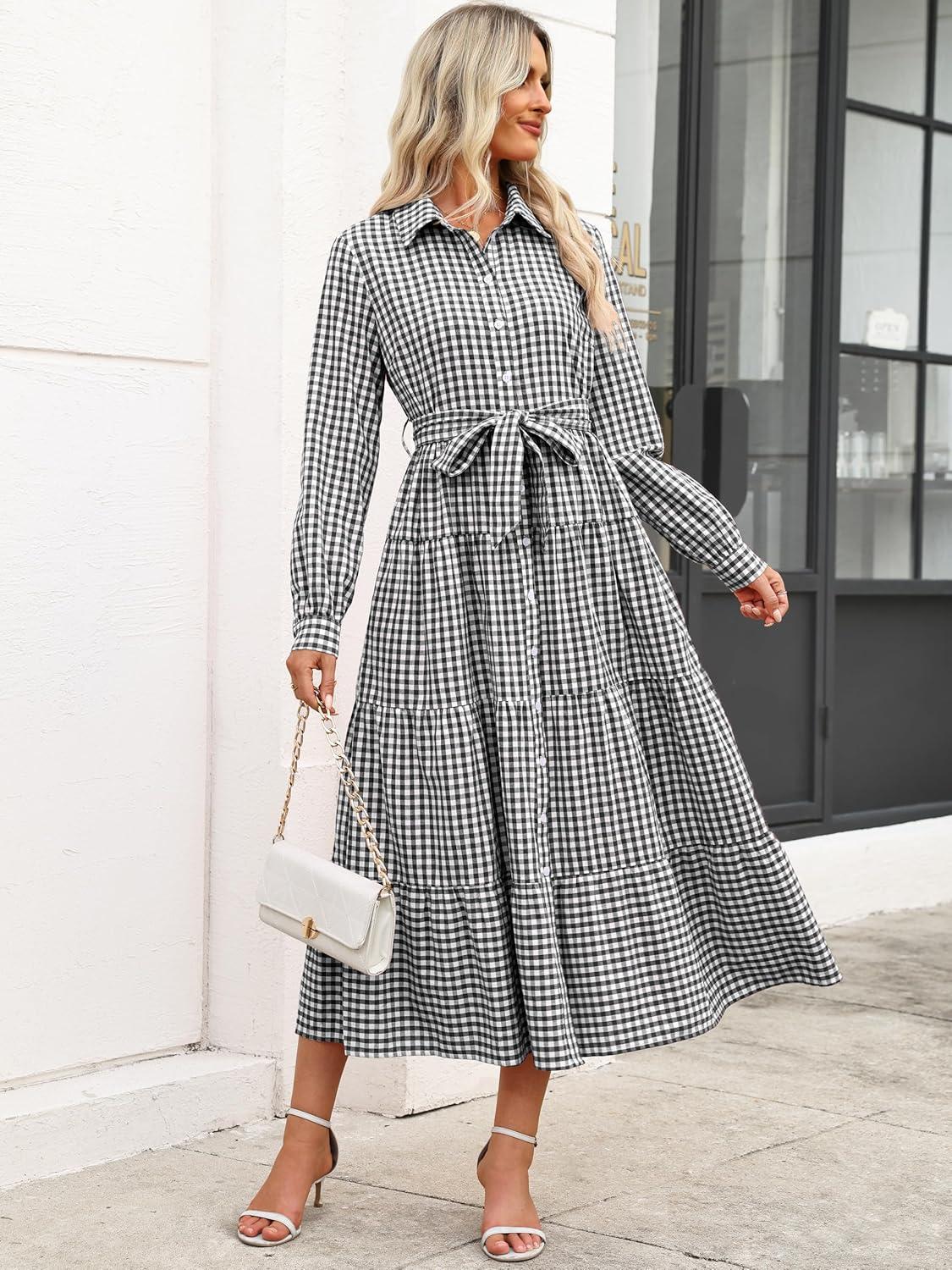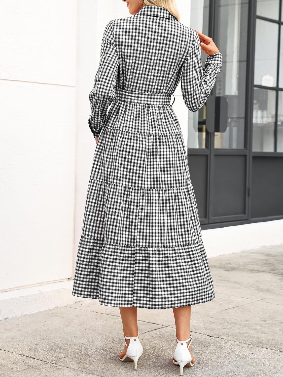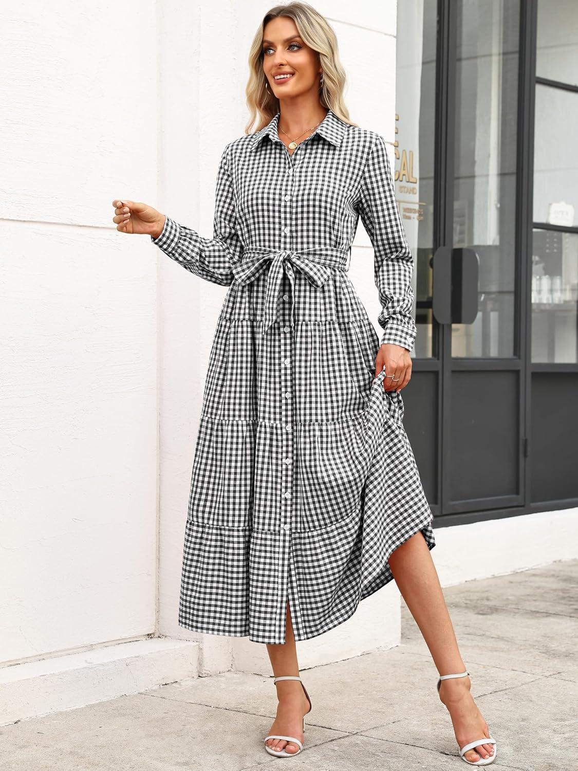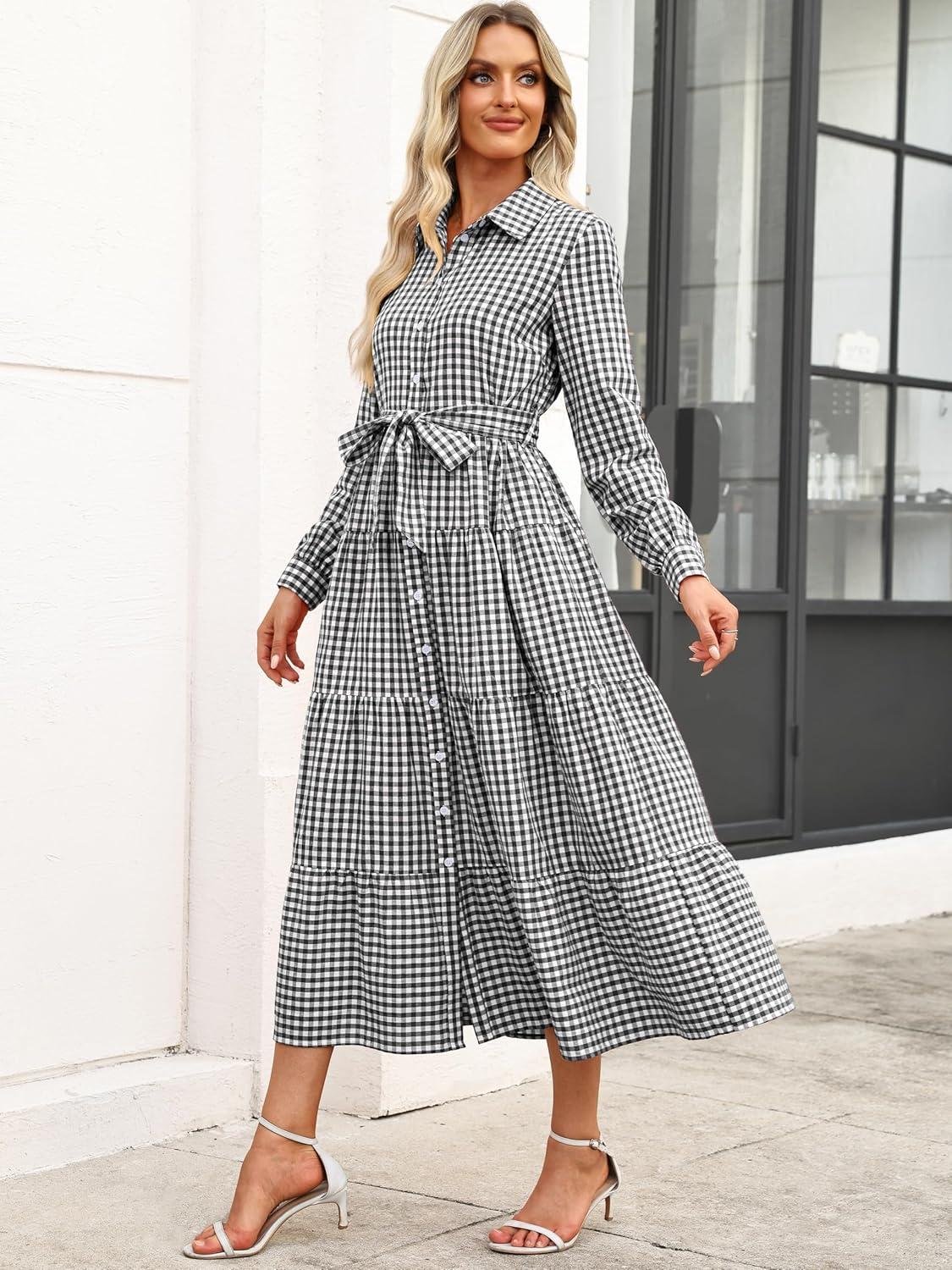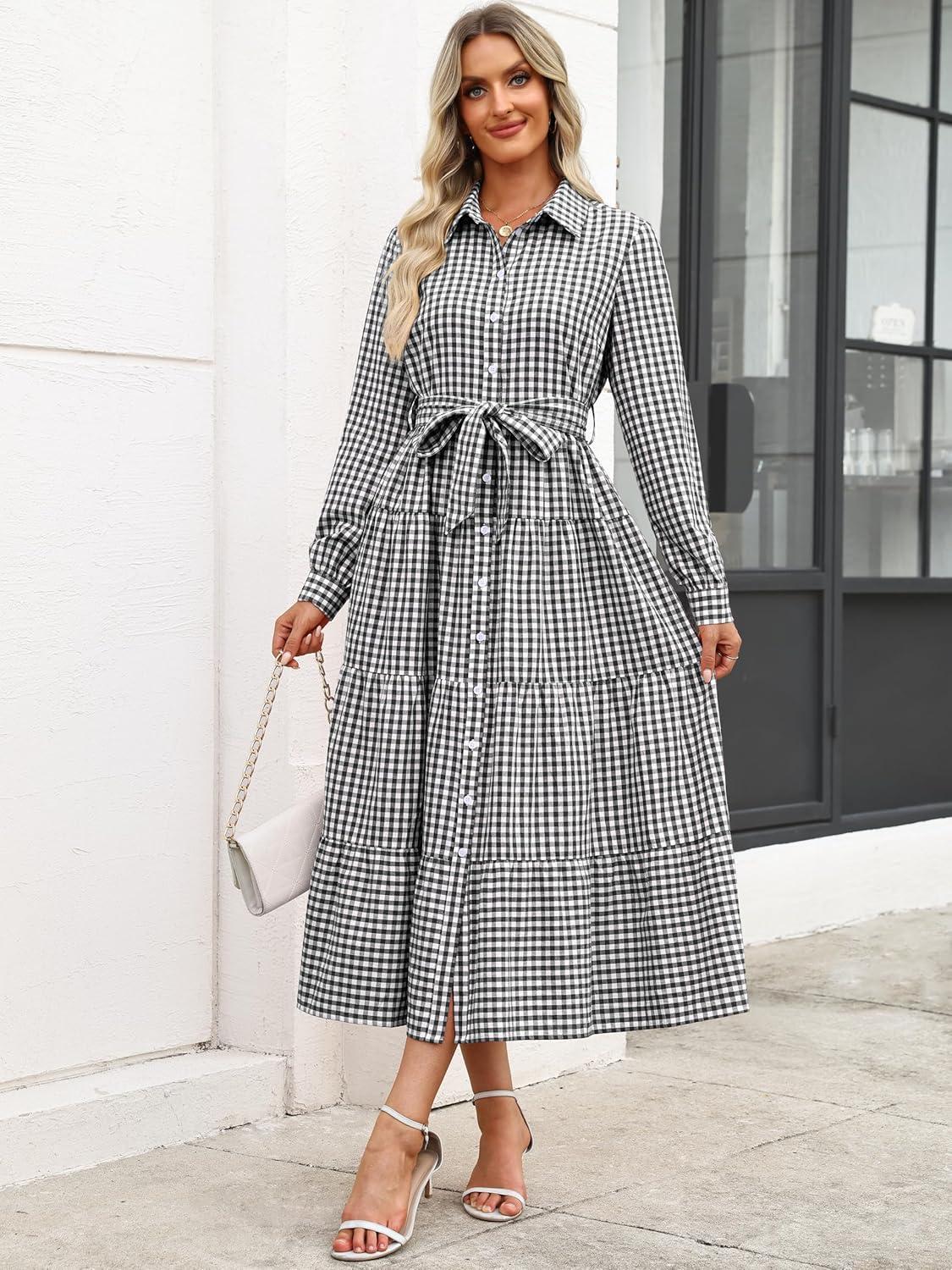 Caracilia Women Long Sleeve Maxi Dress 2025 Fall Casual Button Down Striped Plaid Tie Waist Shirt Dresses Vacation Outfits(Black Plaid)