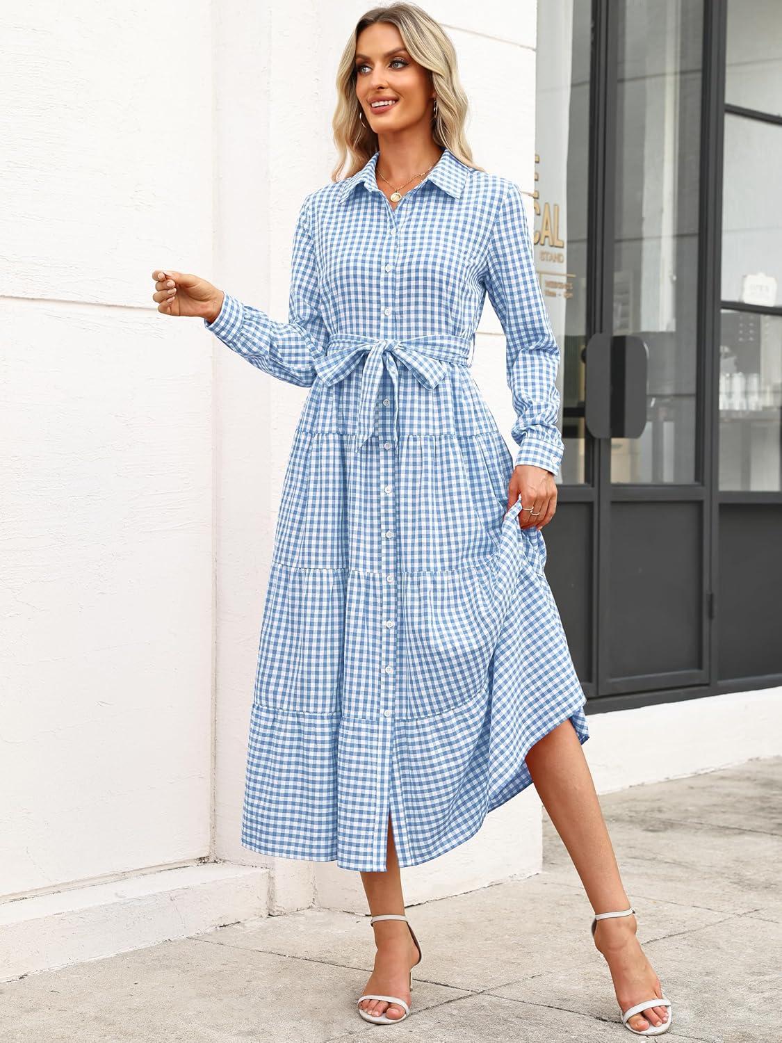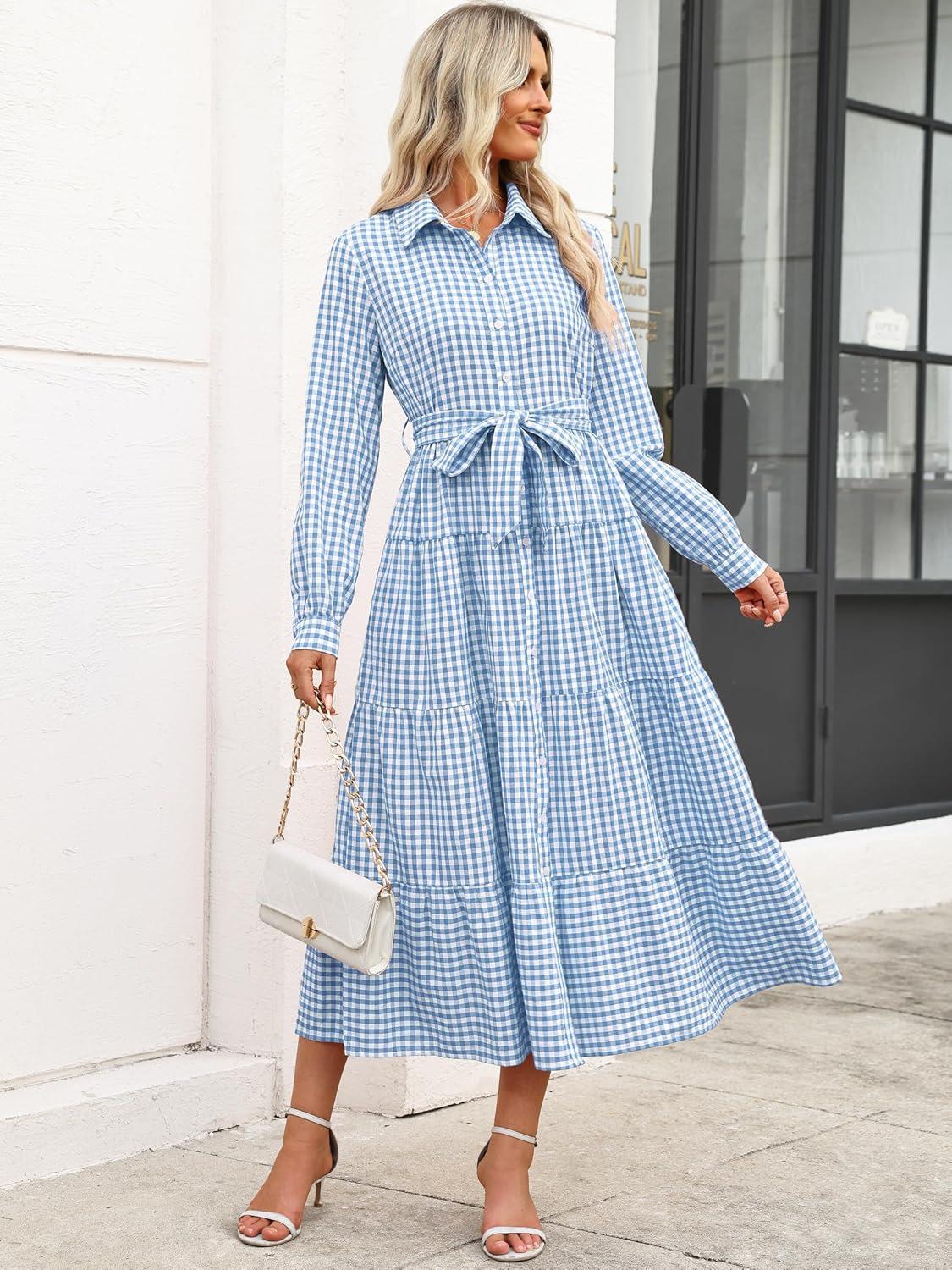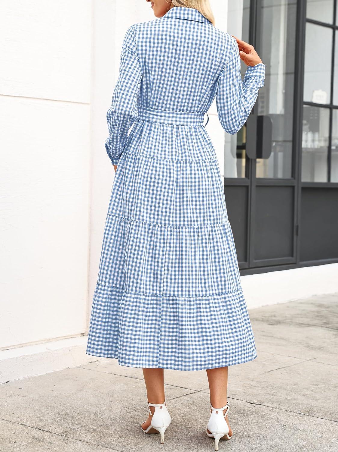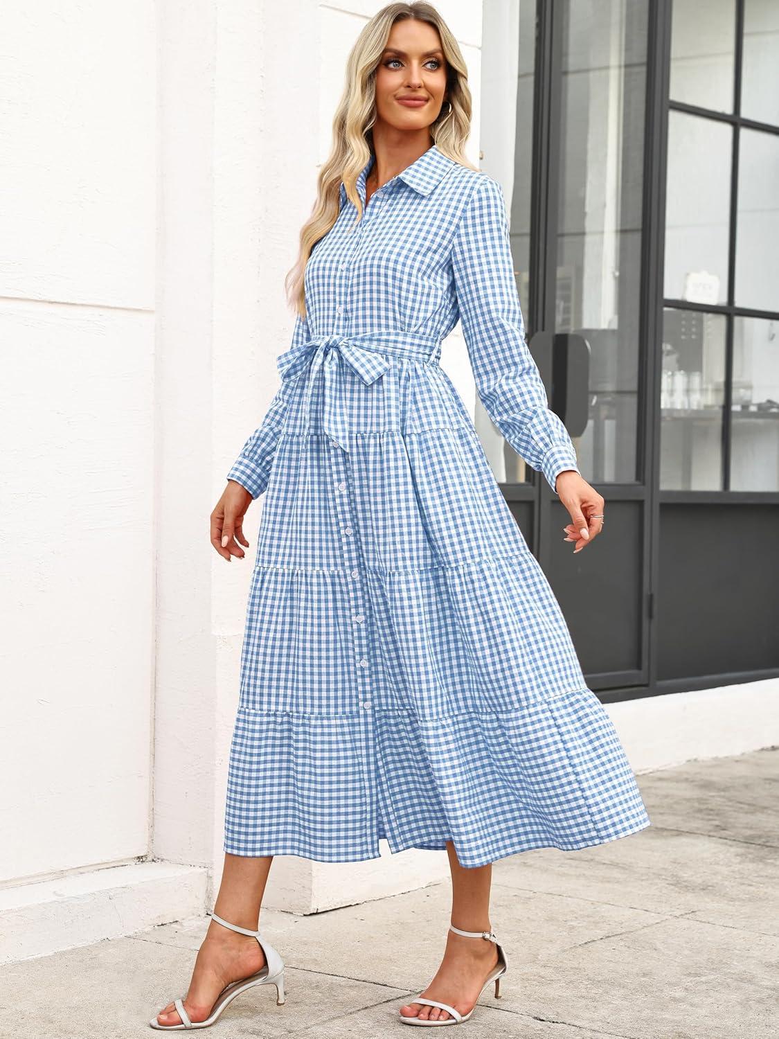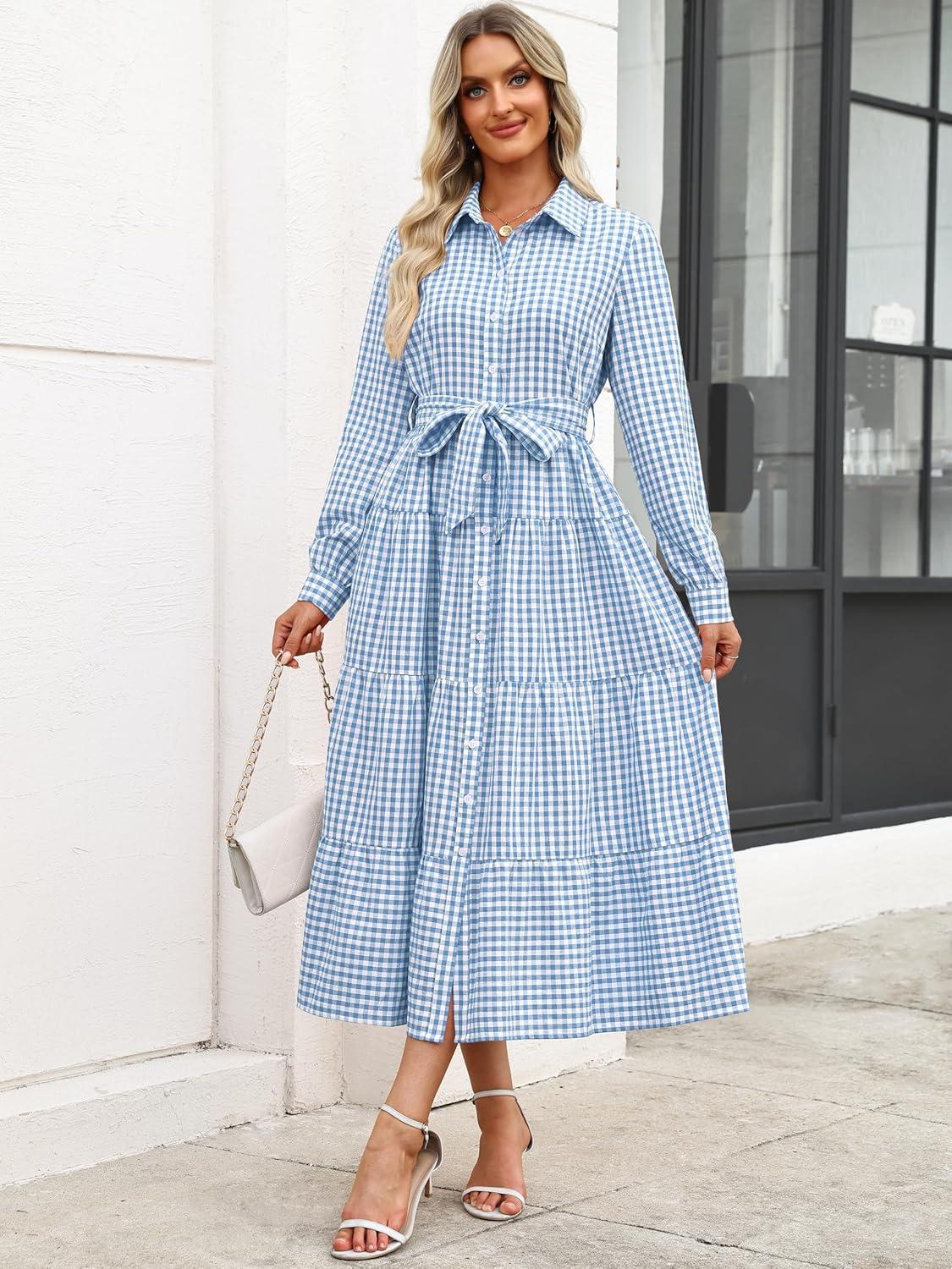 Caracilia Women Long Sleeve Maxi Dress 2025 Fall Casual Button Down Striped Plaid Tie Waist Shirt Dresses Vacation Outfits(Light Blue Plaid)