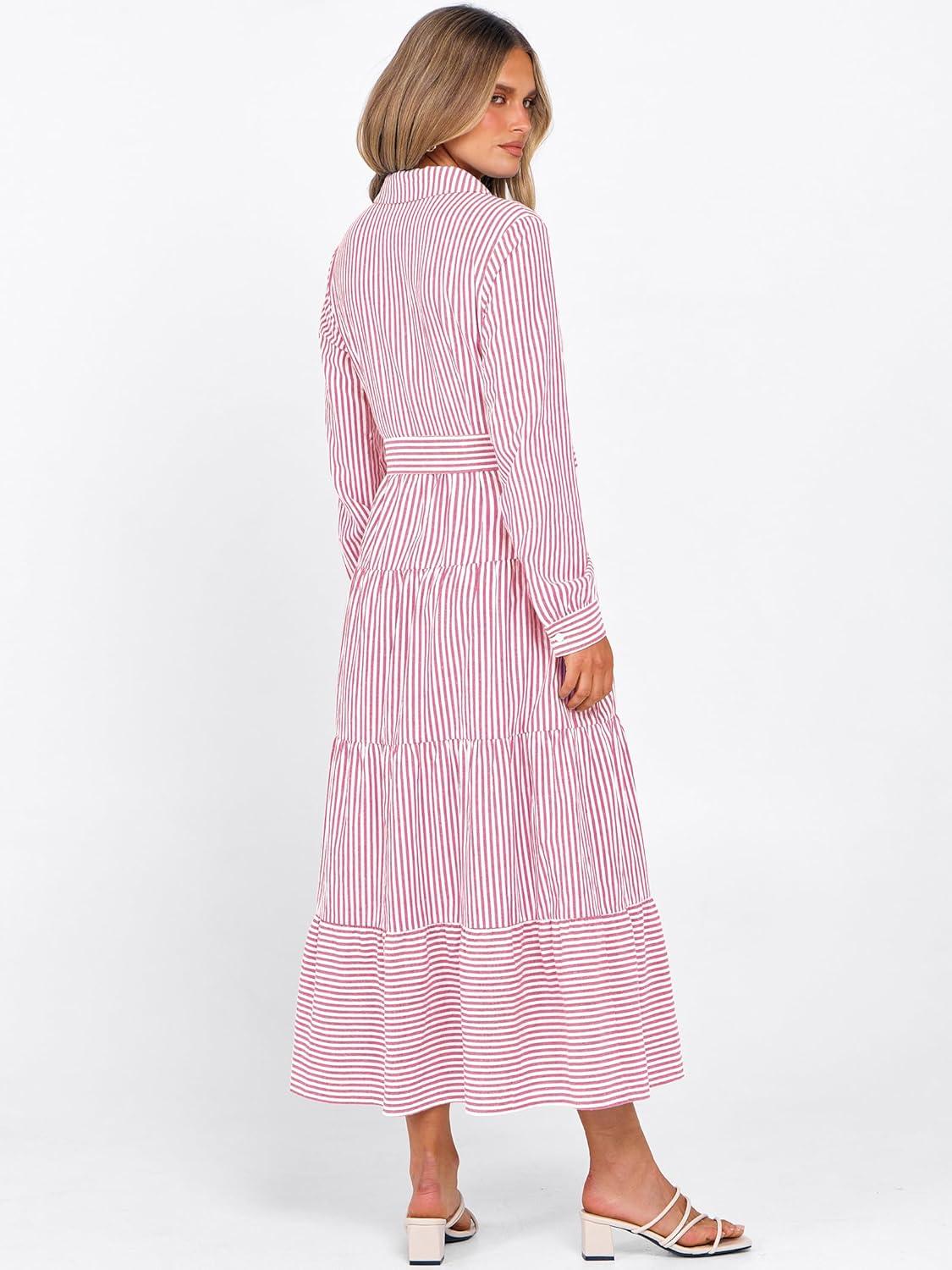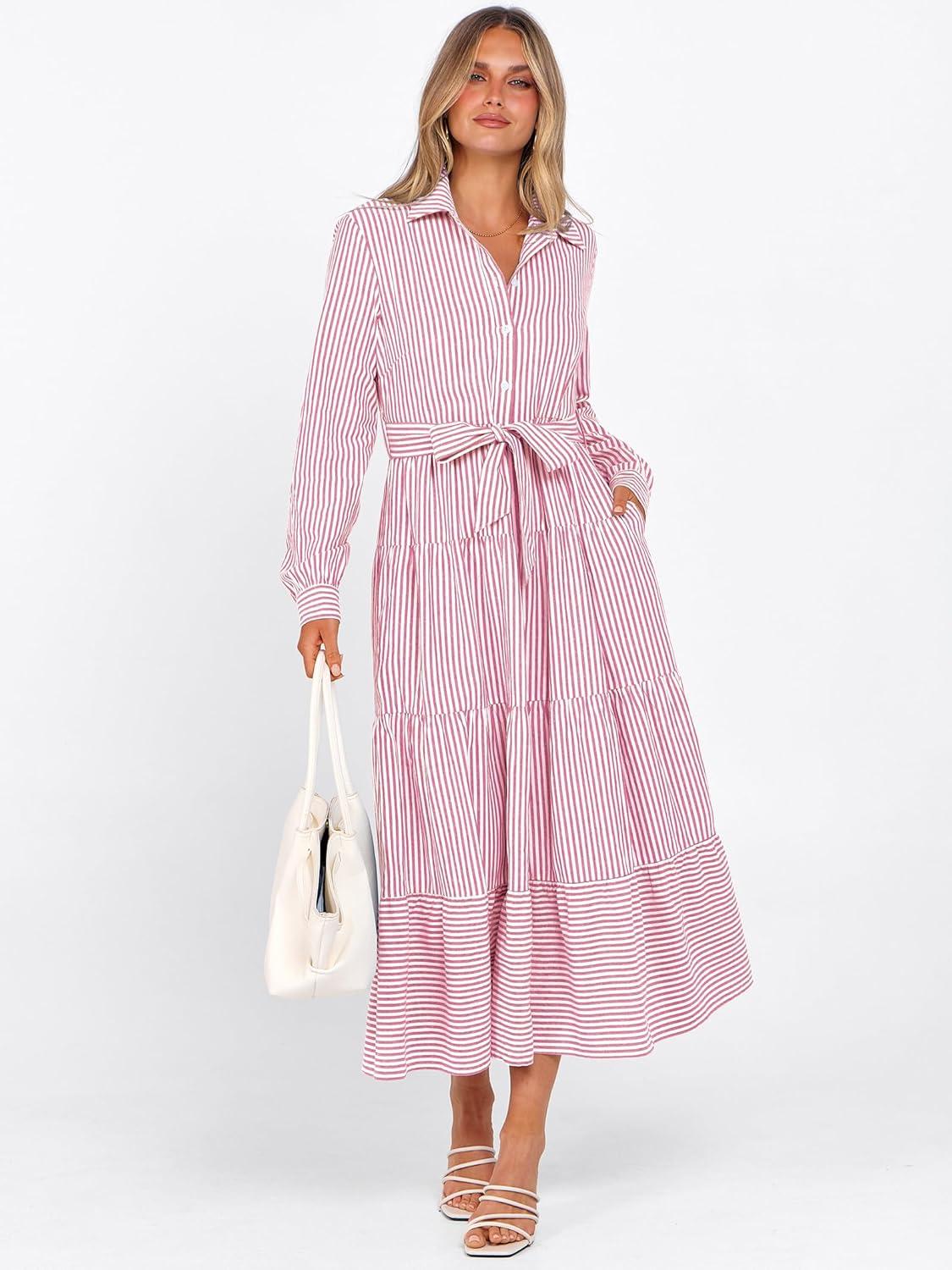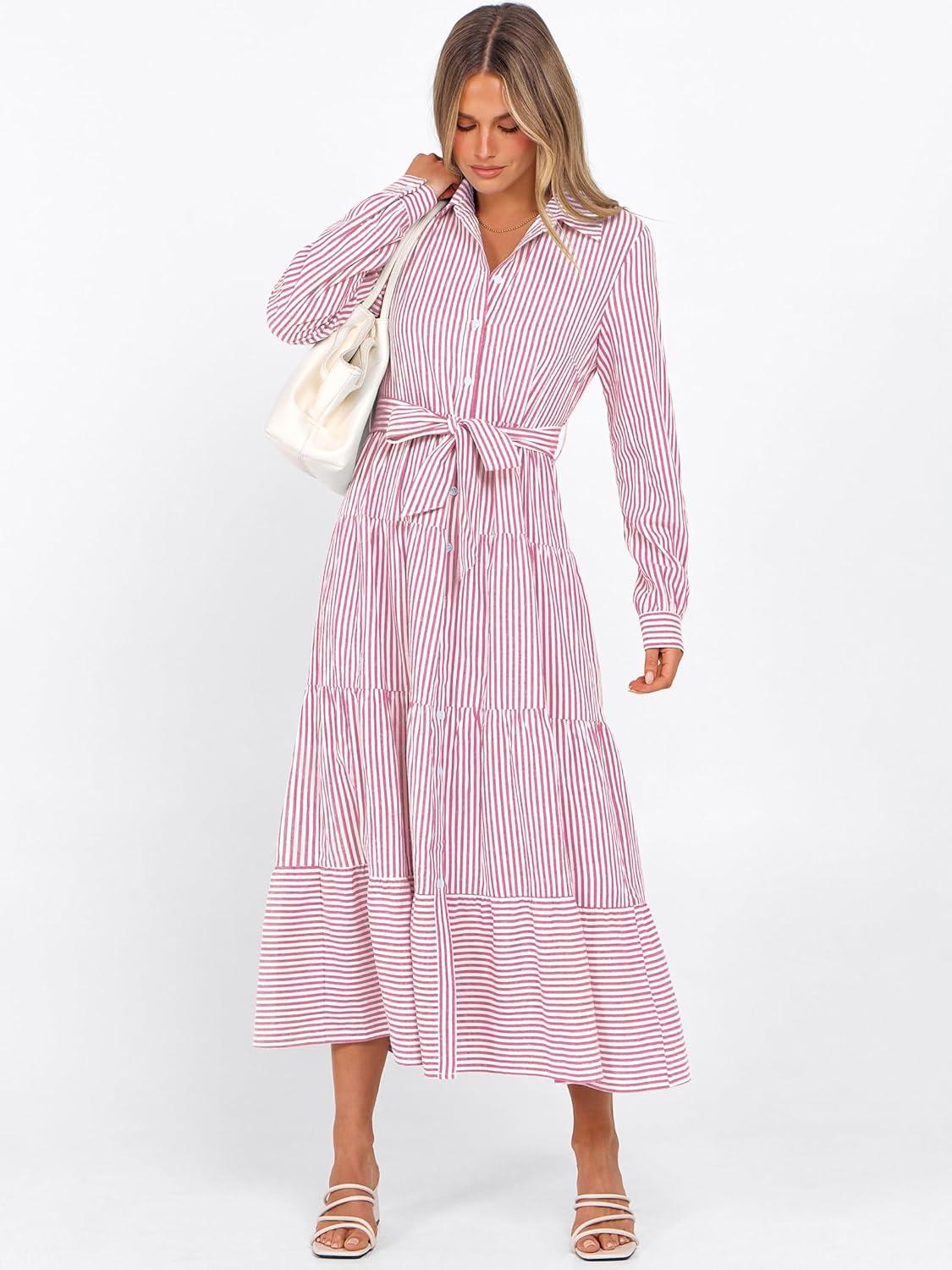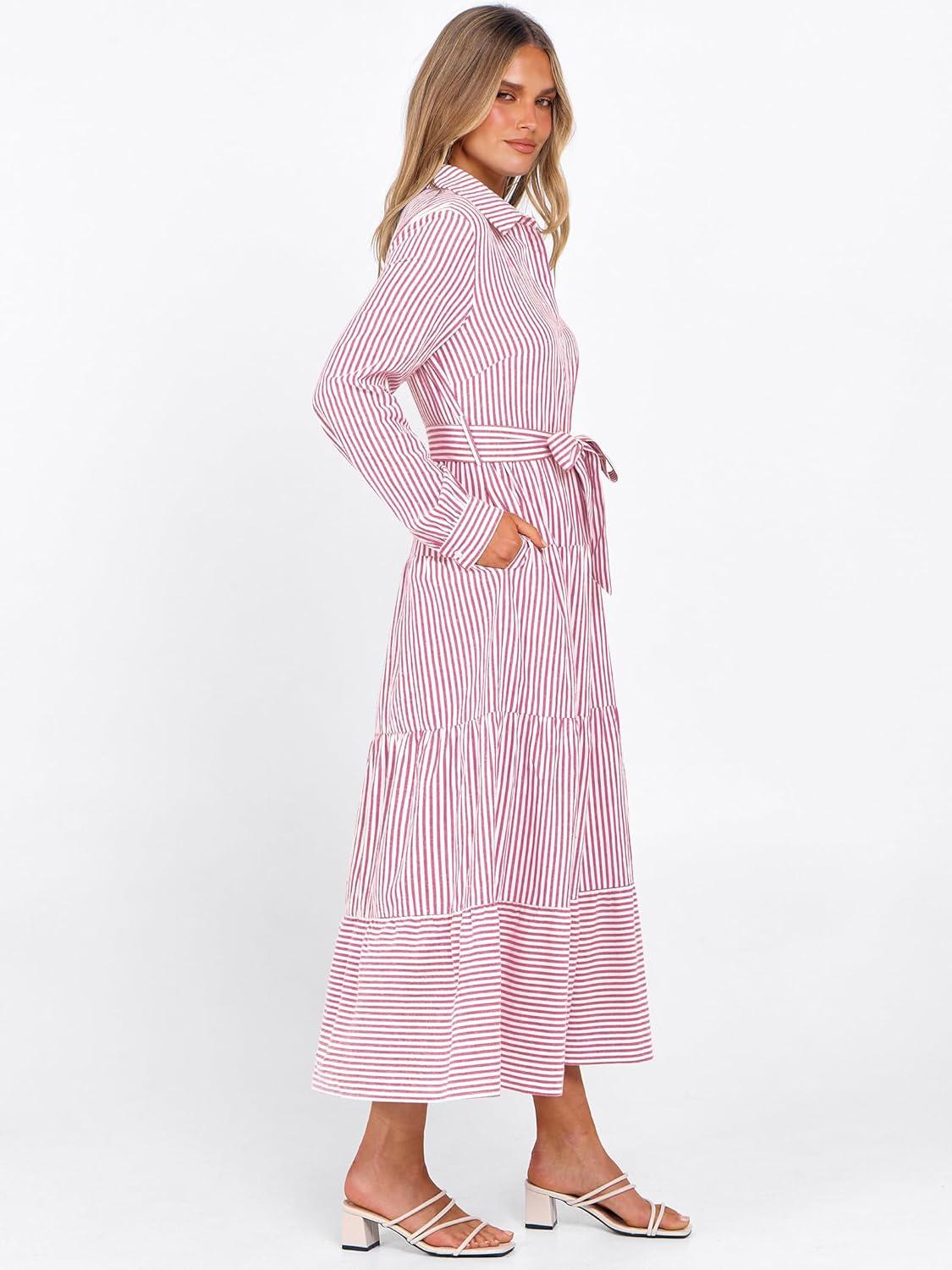 Caracilia Women Long Sleeve Maxi Dress 2025 Fall Casual Button Down Striped Plaid Tie Waist Shirt Dresses Vacation Outfits(Pink Stripe)