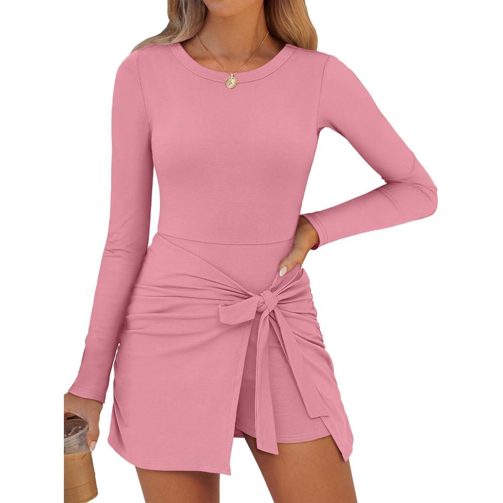 Caracilia Women Long Sleeve Tennis Dress 2025 Fall Bodycon Tie Waist Romper Skorts Athletic Mini Dresses Built in Shorts(Coral)