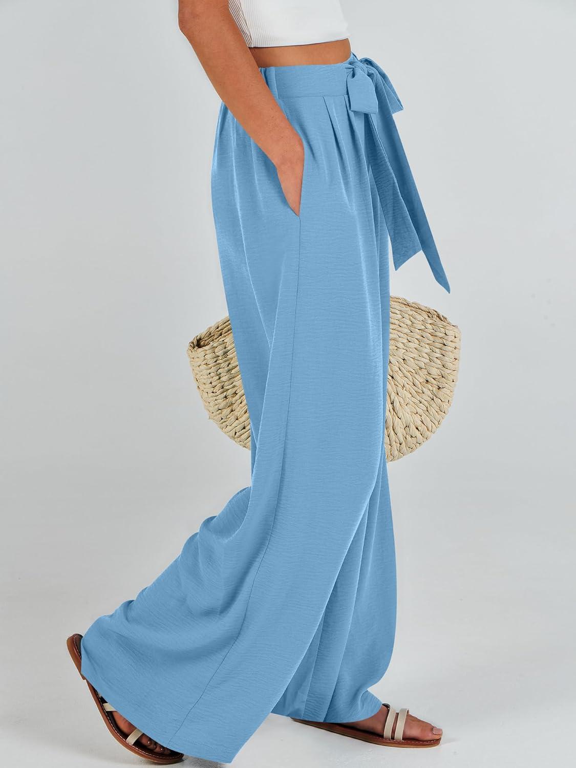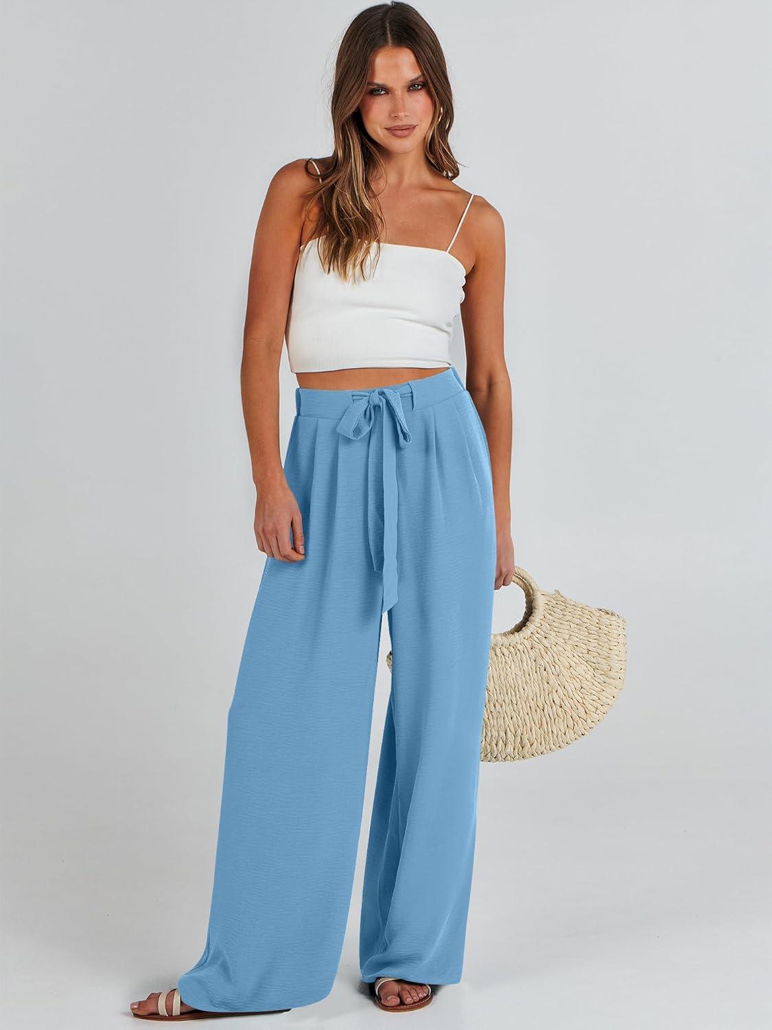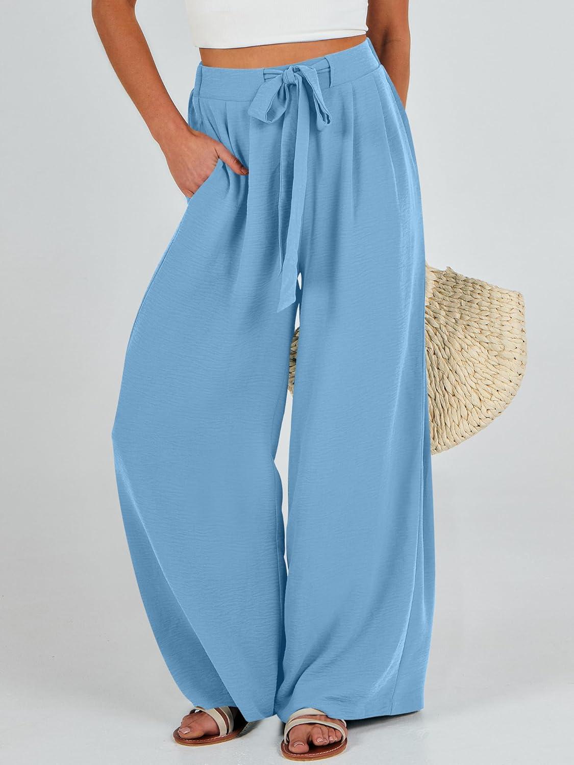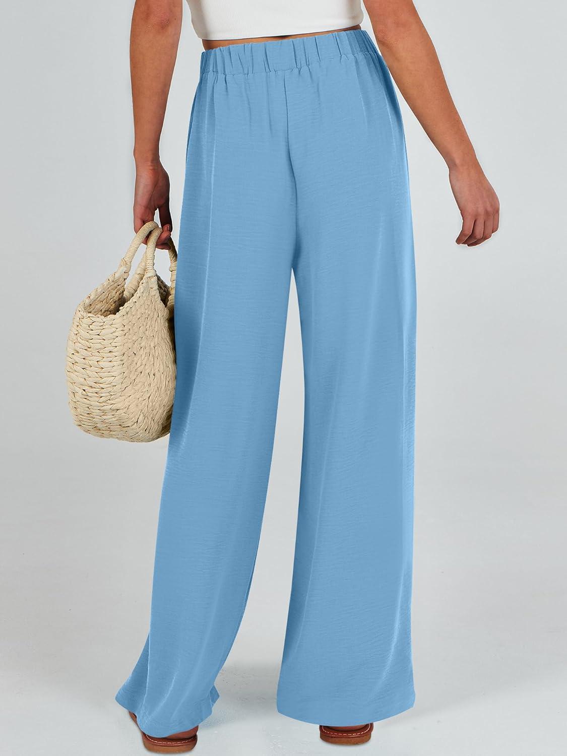 Caracilia Women Wide Leg Palazzo Pants Summer High Waist Flowy Casual Trousers Loose Lounge Beach Travel Vacation Clothes(Bright Blue)