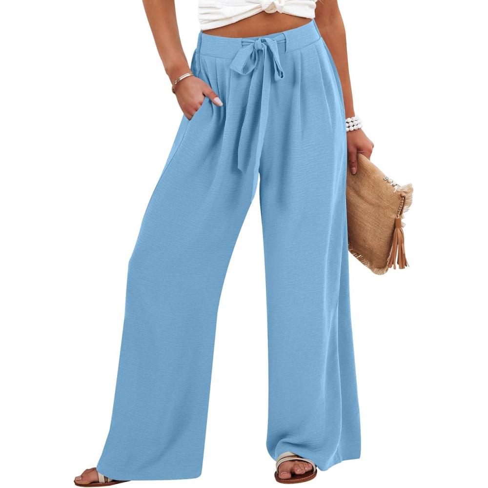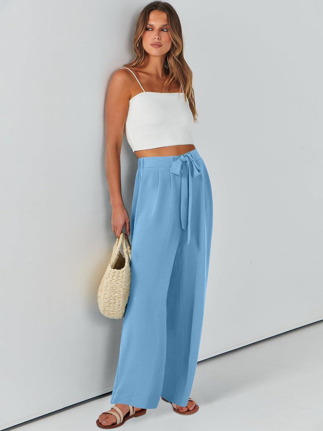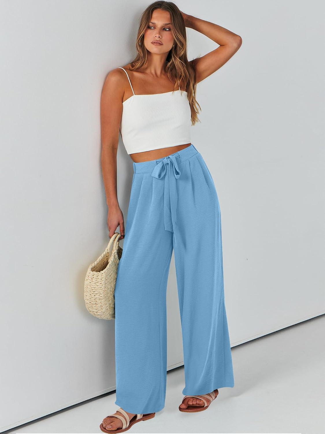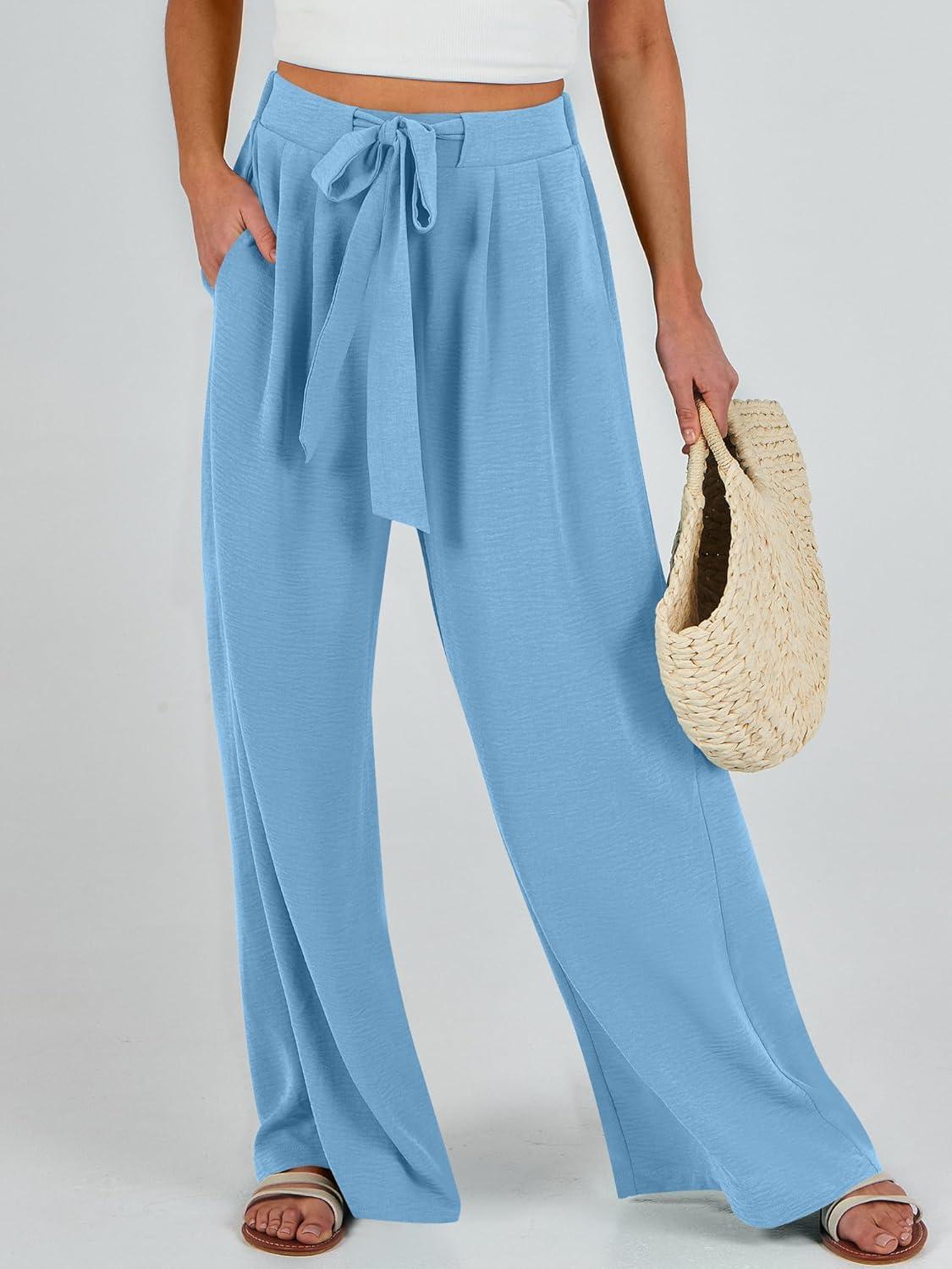 Caracilia Women Wide Leg Palazzo Pants Summer High Waist Flowy Casual Trousers Loose Lounge Beach Travel Vacation Clothes(Bright Blue)