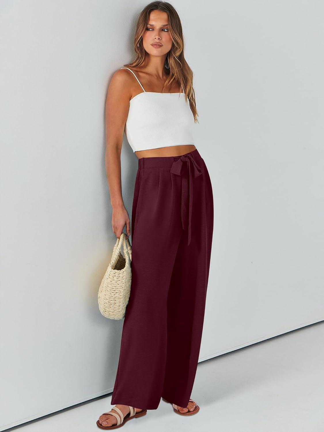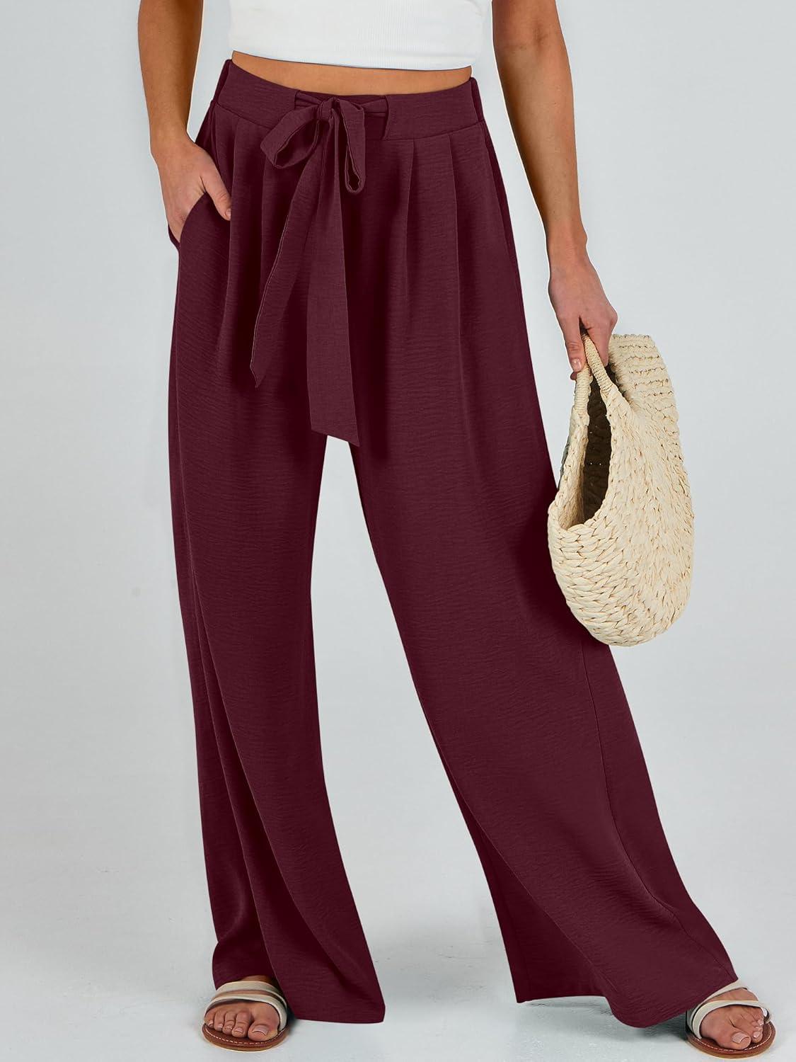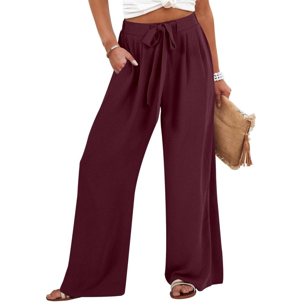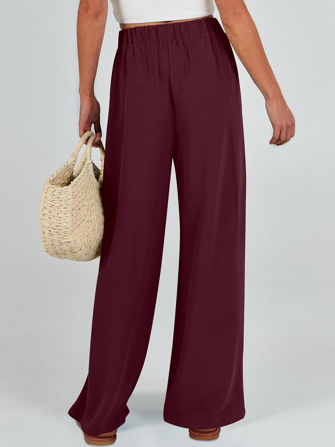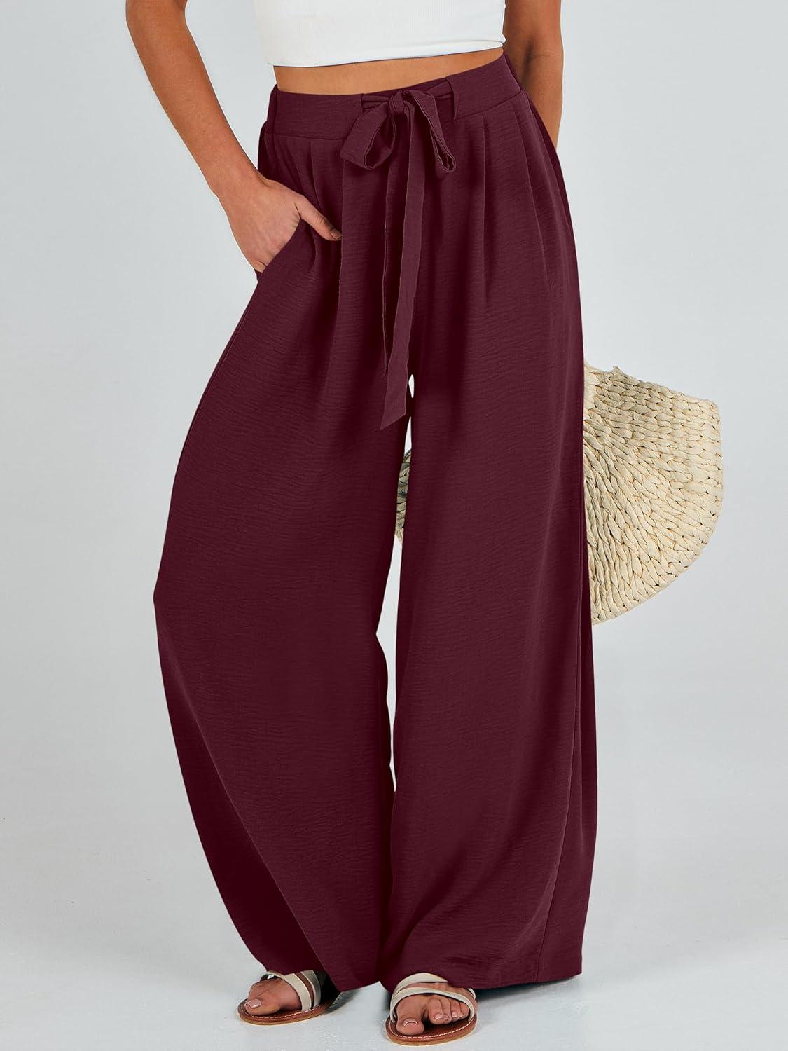 Caracilia Women Wide Leg Palazzo Pants Summer High Waist Flowy Casual Trousers Loose Lounge Beach Travel Vacation Clothes(Wine Red)