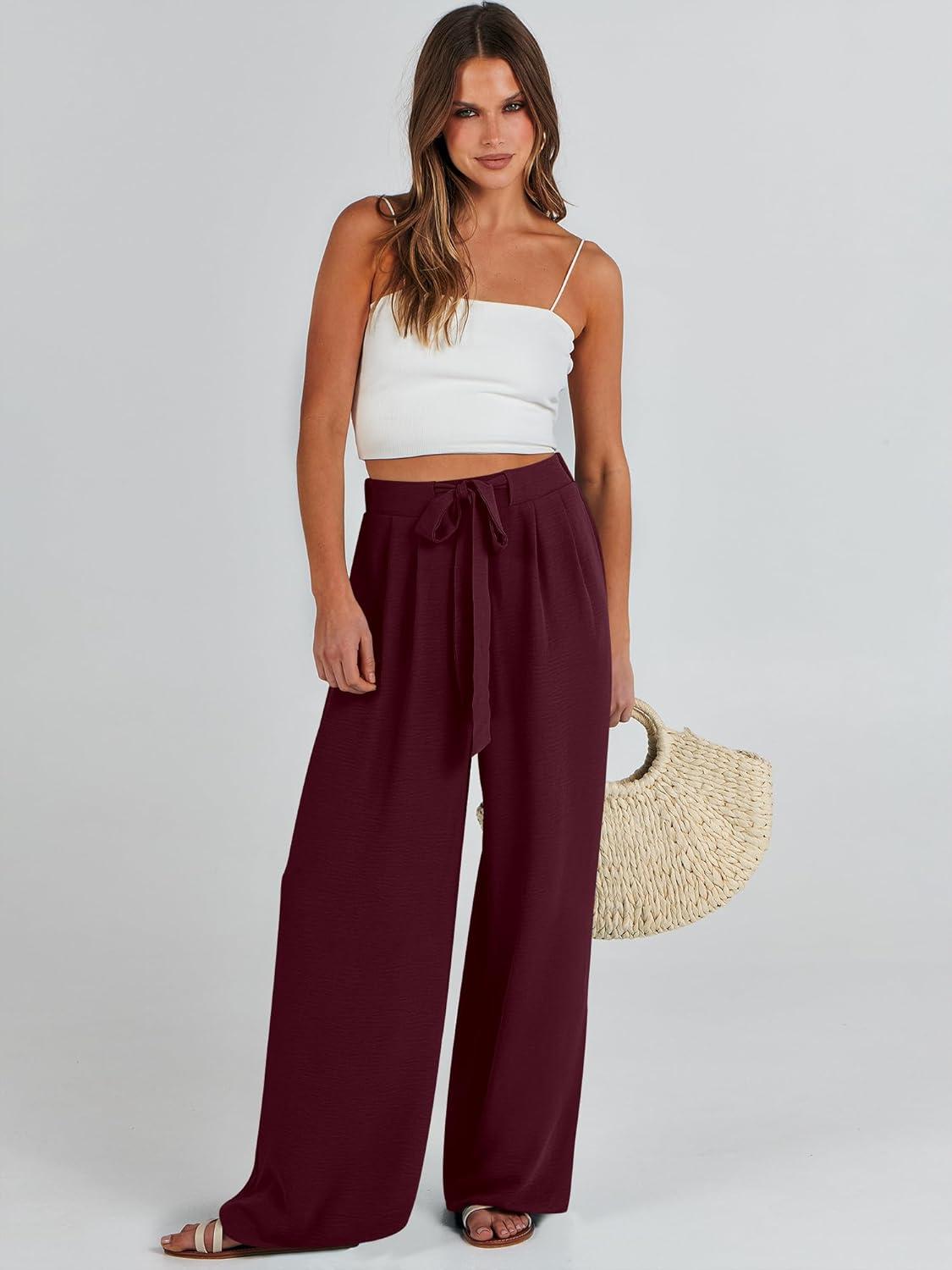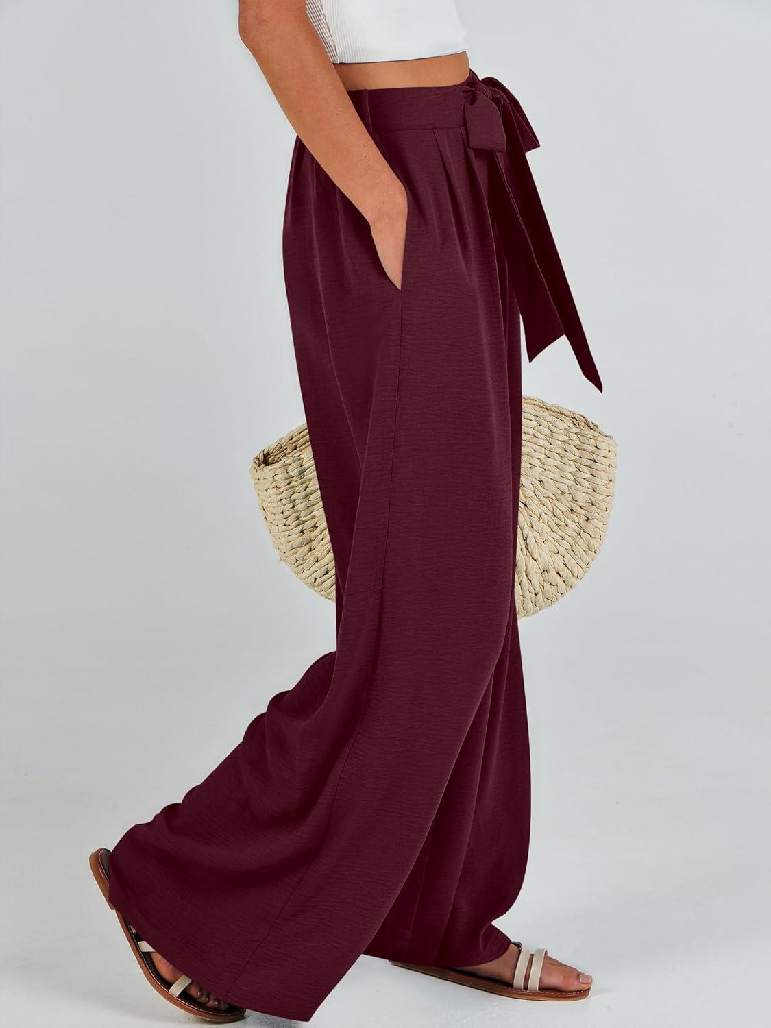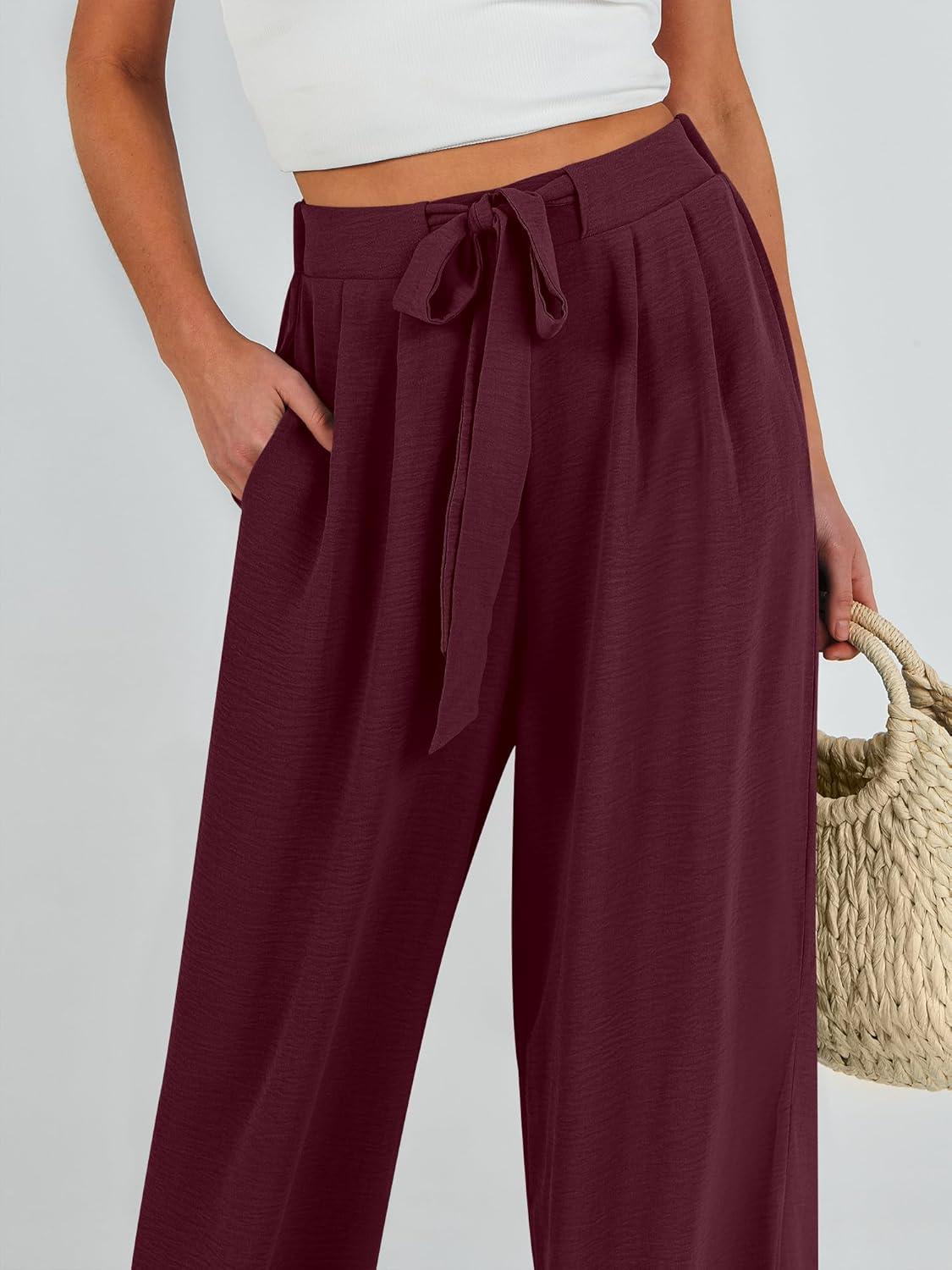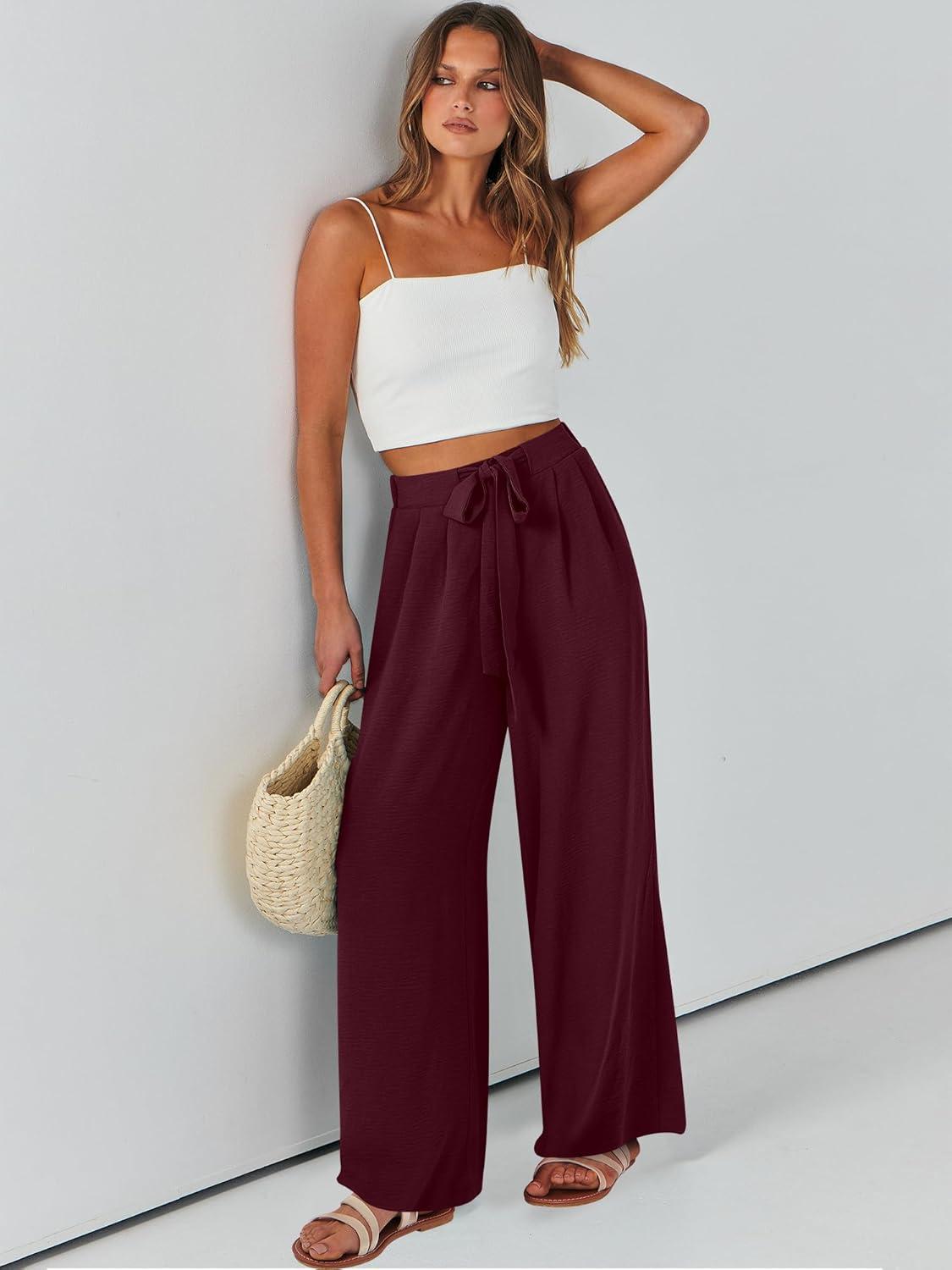 Caracilia Women Wide Leg Palazzo Pants Summer High Waist Flowy Casual Trousers Loose Lounge Beach Travel Vacation Clothes(Wine Red)