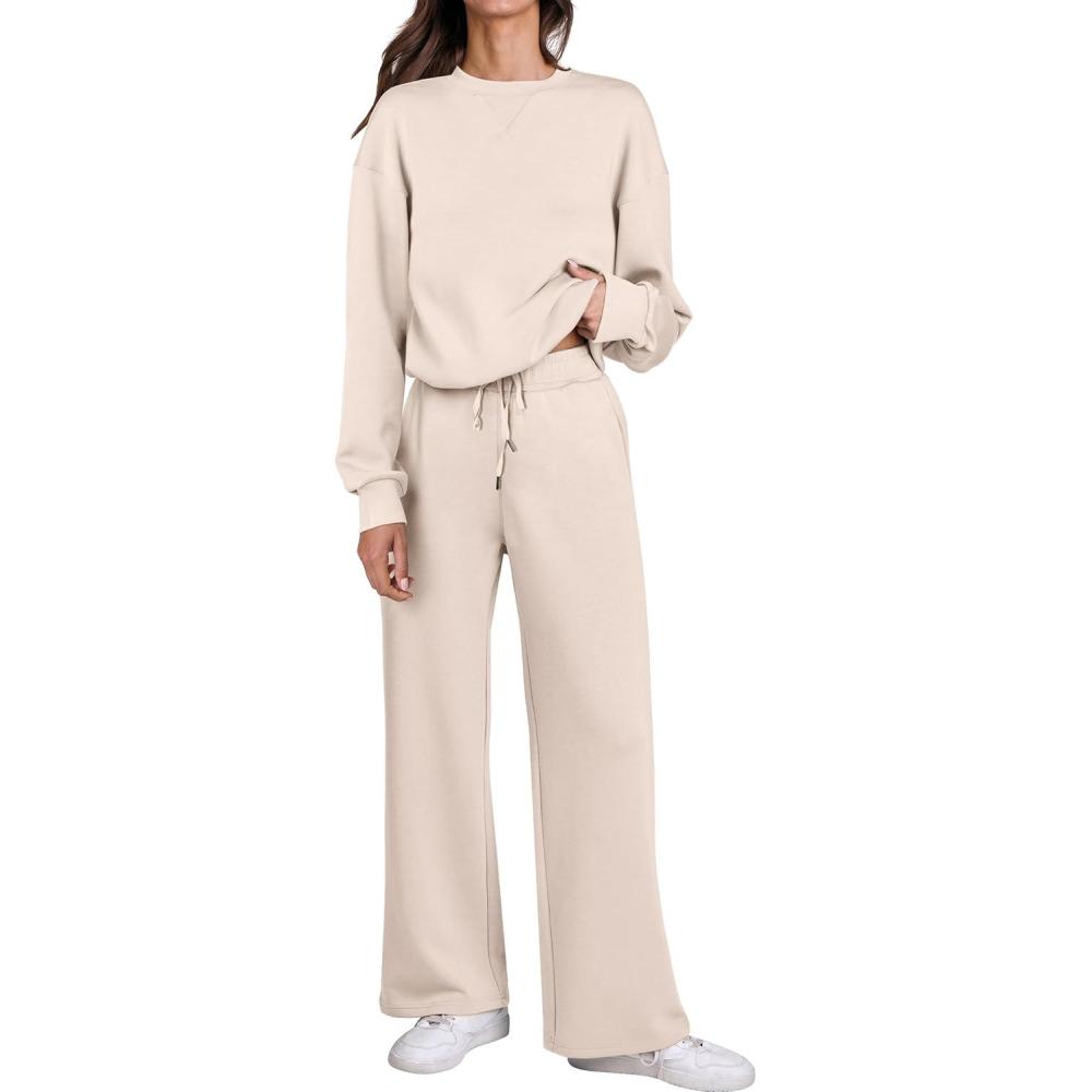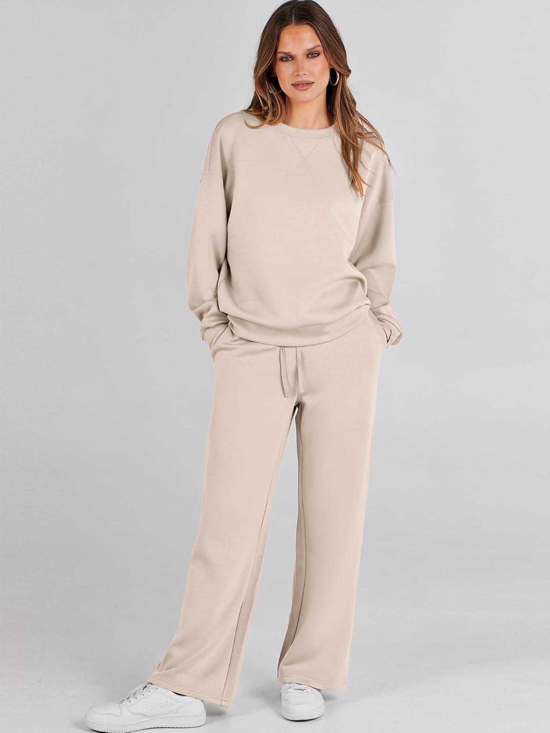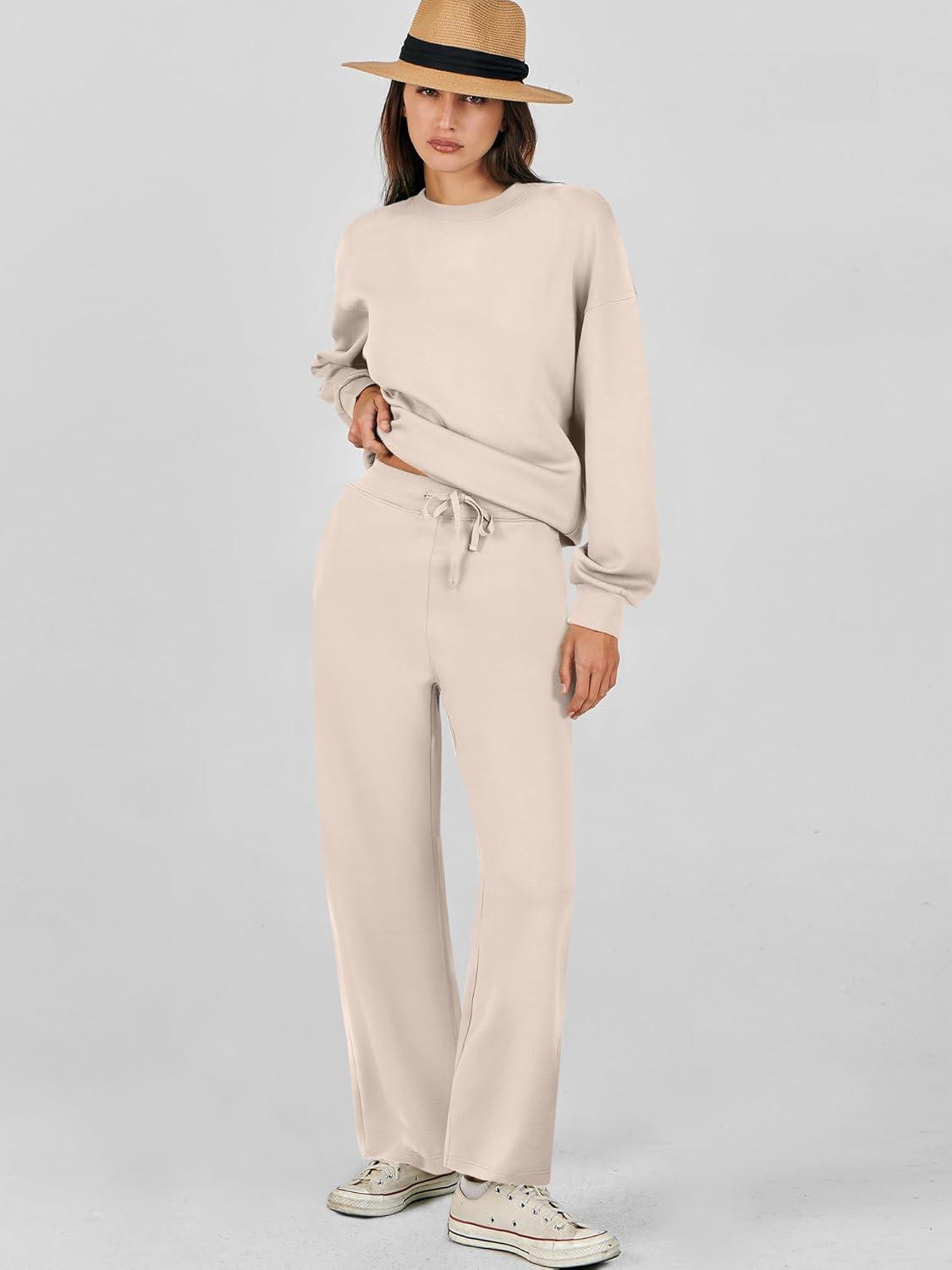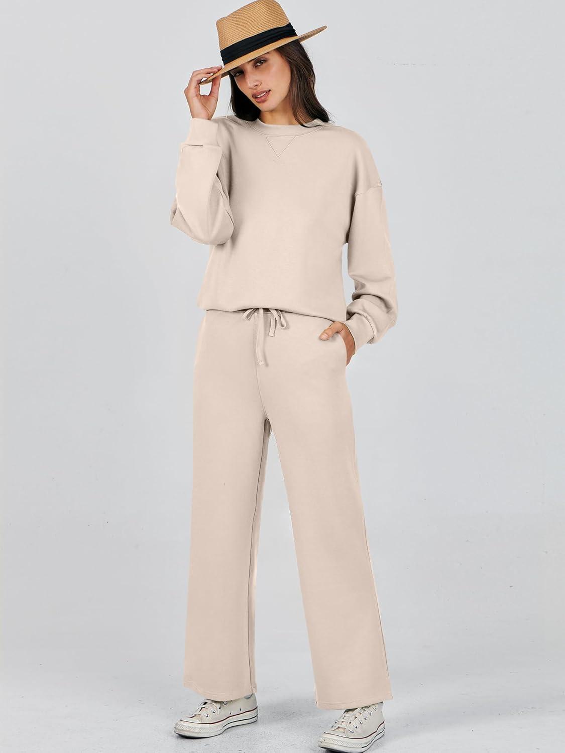 Caracilia Women’s 2 Piece Outfits Sweatsuit Fall Crewneck Sweatshirts Wide Leg Pants Lounge Matching Sweat Sets Tracksuit(Almond)