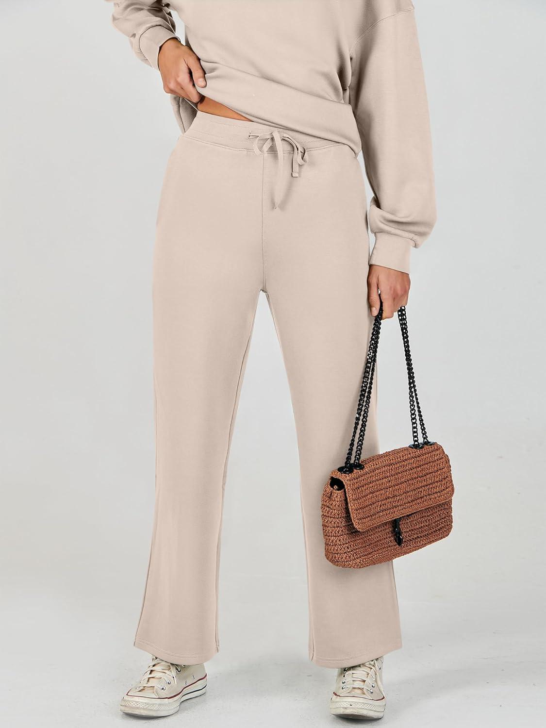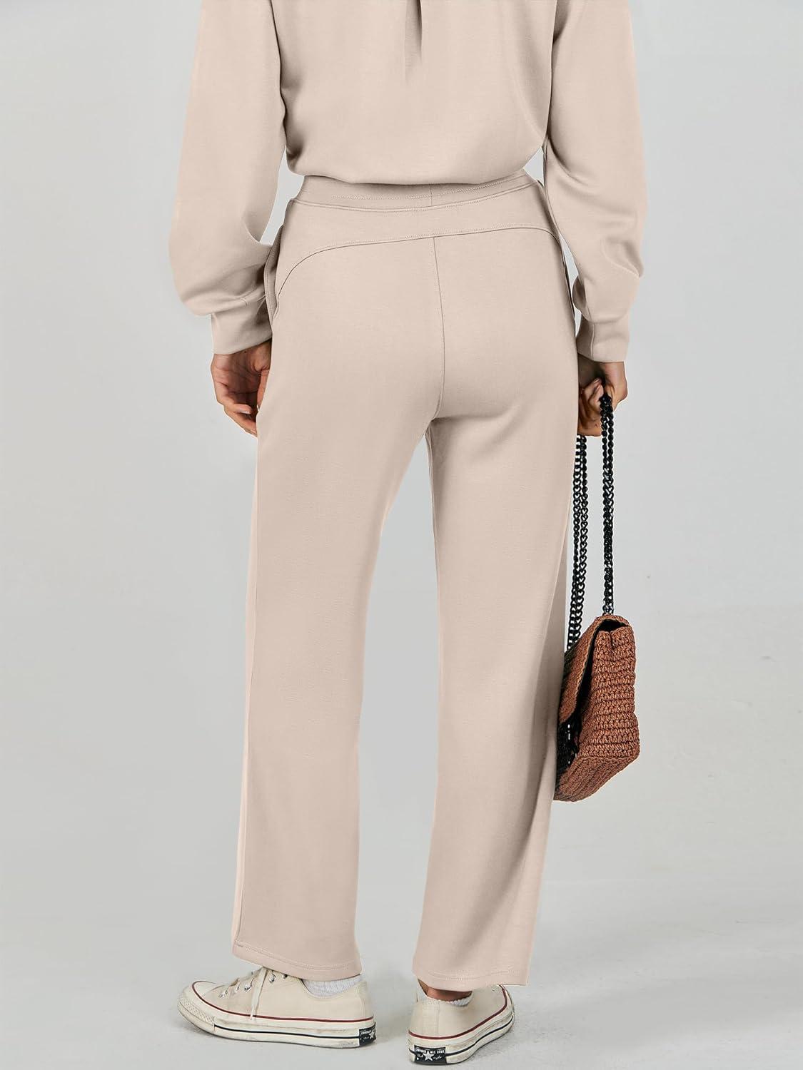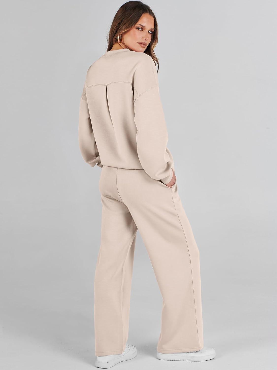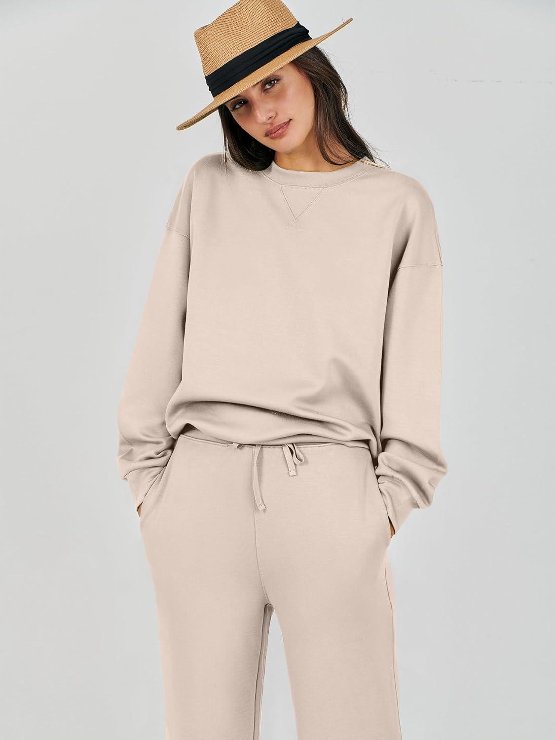 Caracilia Women’s 2 Piece Outfits Sweatsuit Fall Crewneck Sweatshirts Wide Leg Pants Lounge Matching Sweat Sets Tracksuit(Almond)