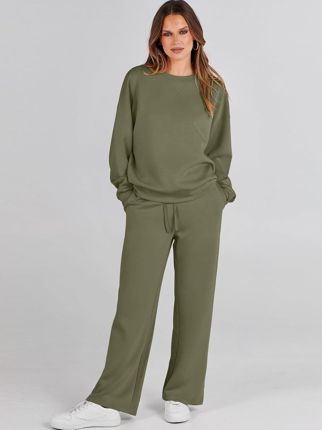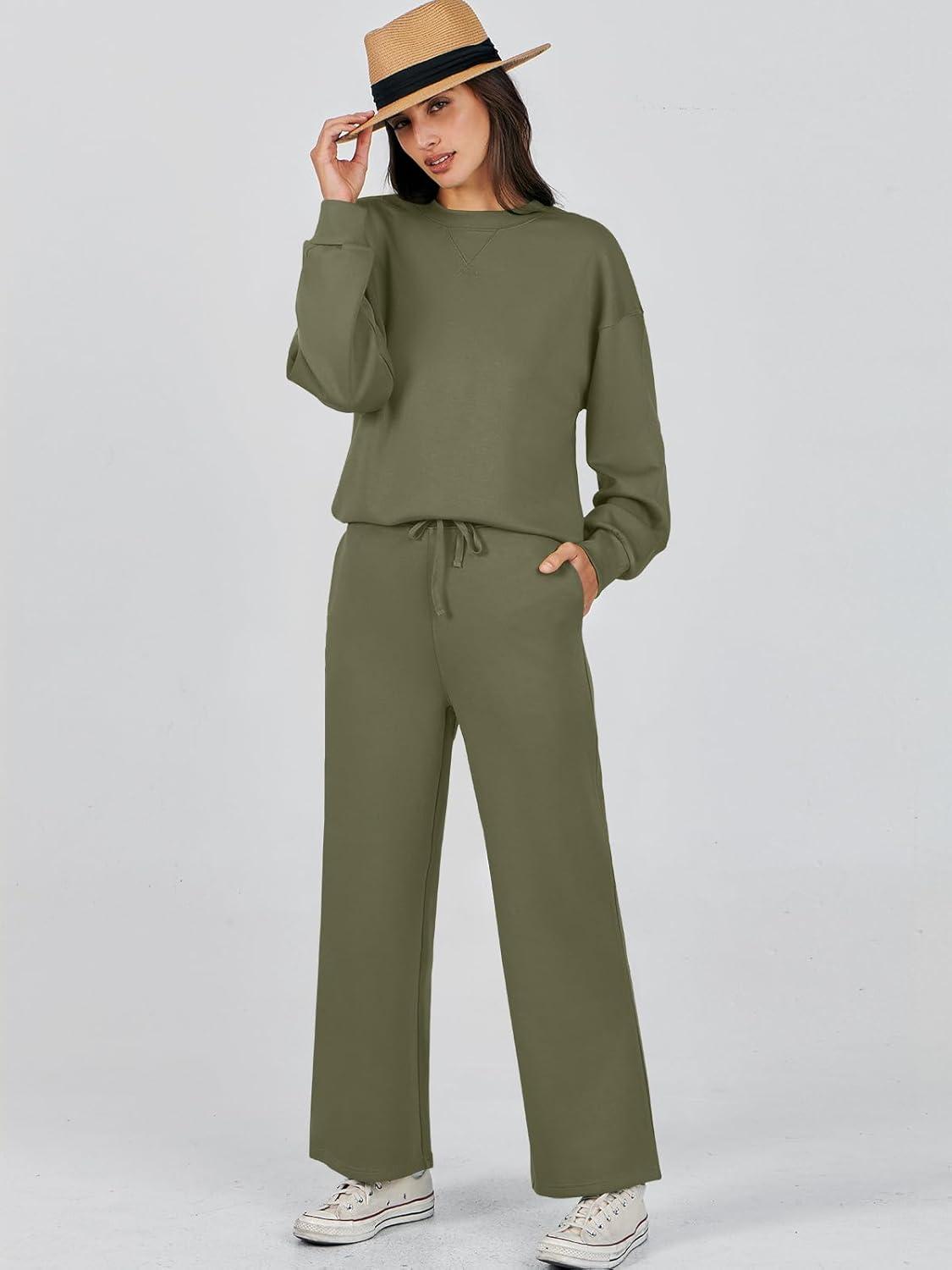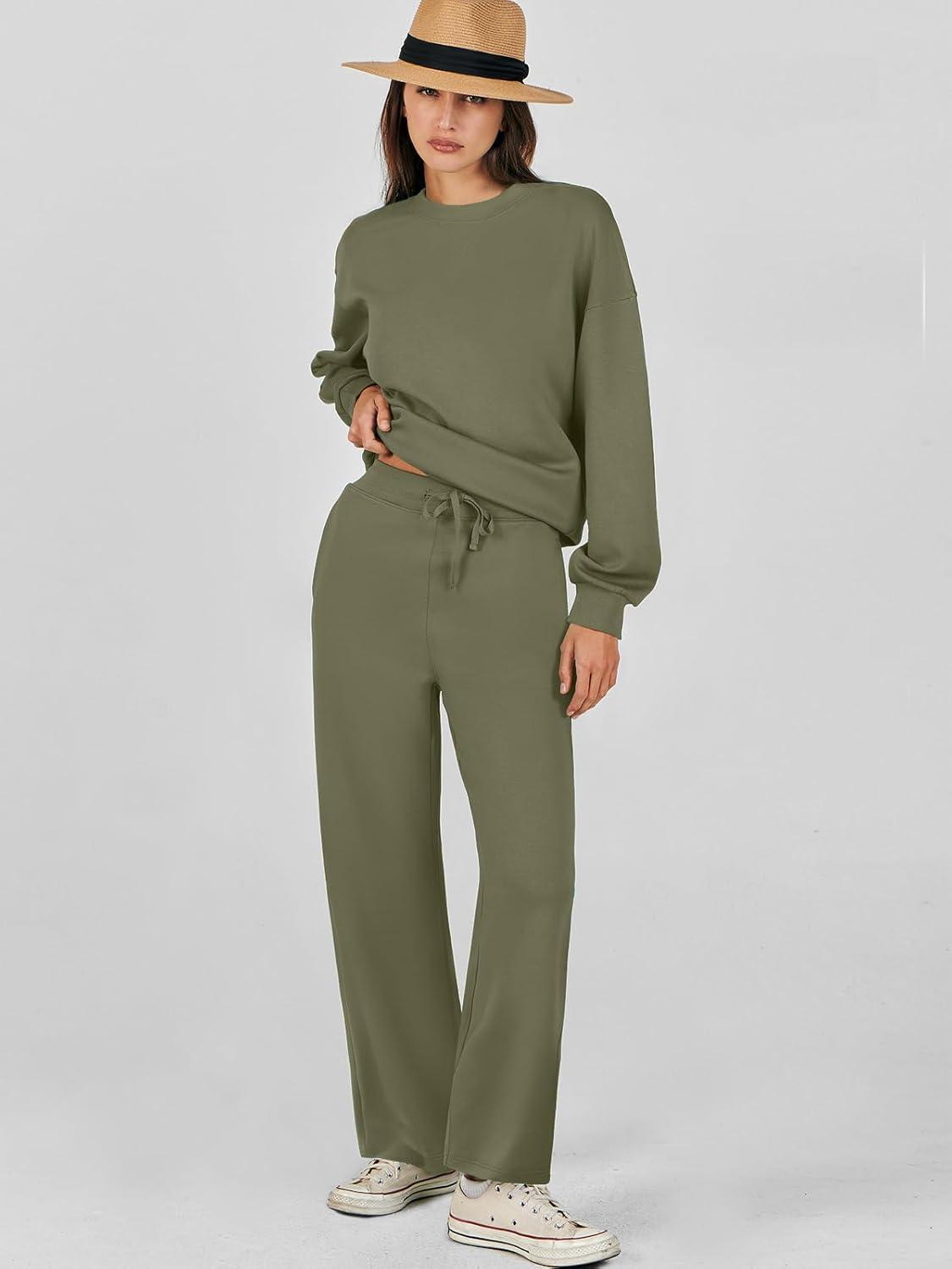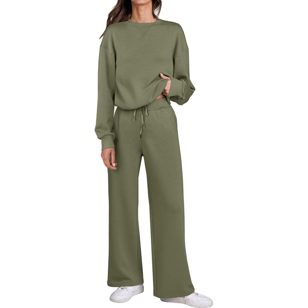 Caracilia Women’s 2 Piece Outfits Sweatsuit Fall Crewneck Sweatshirts Wide Leg Pants Lounge Matching Sweat Sets Tracksuit(Grey Green)