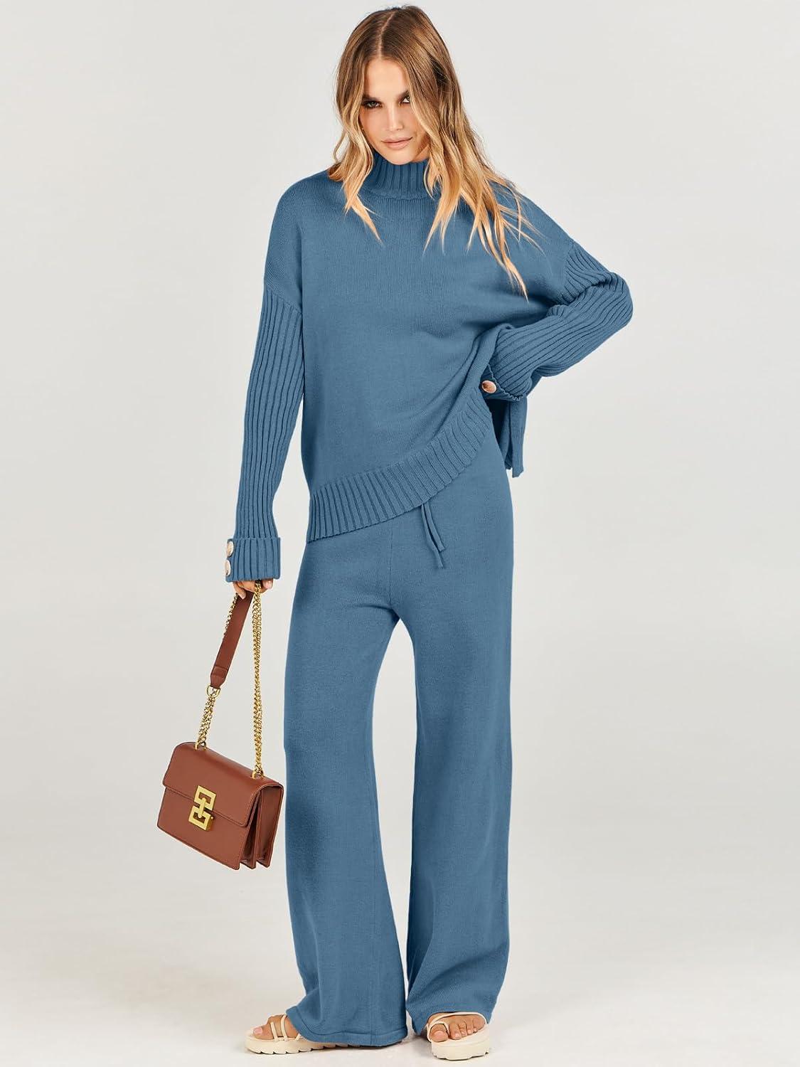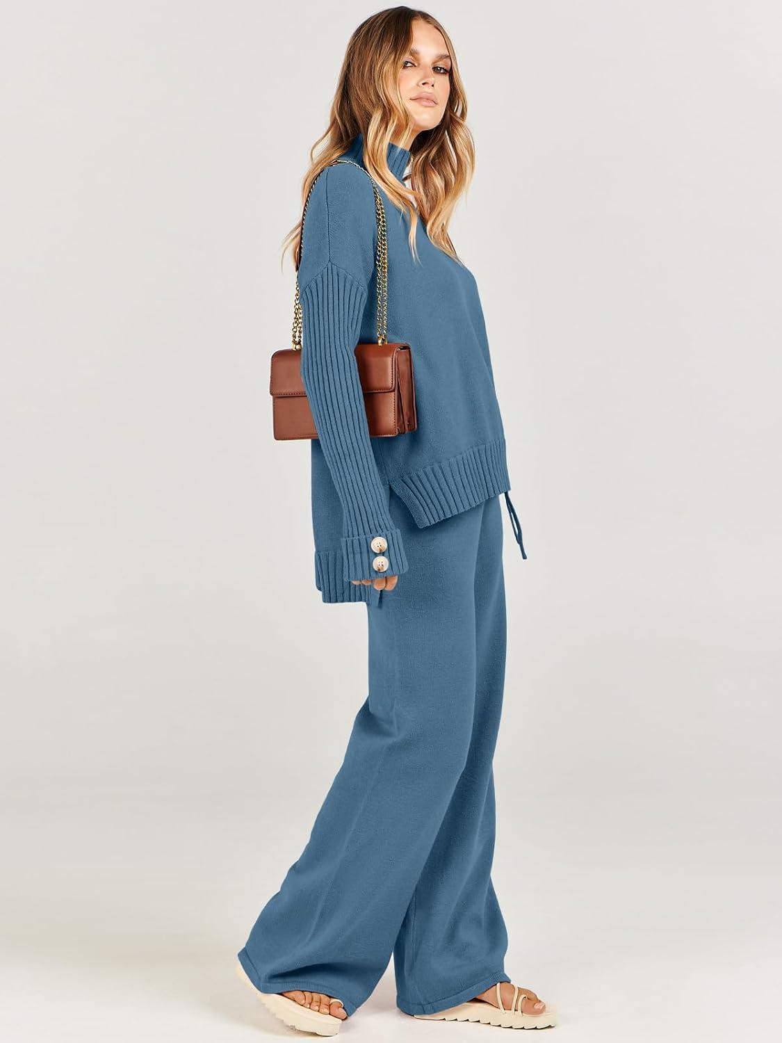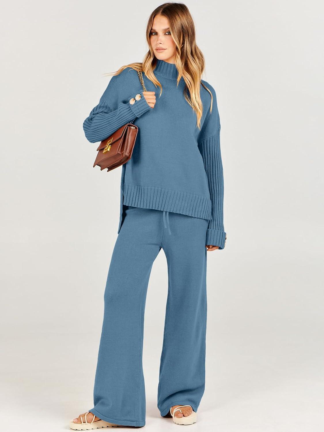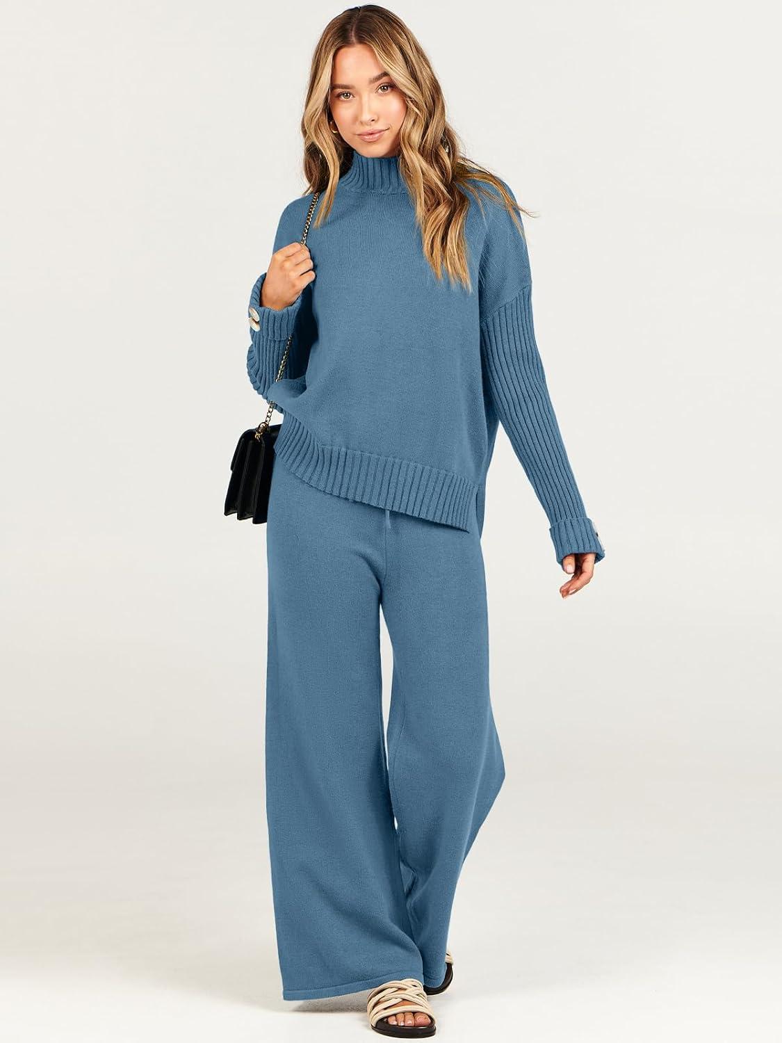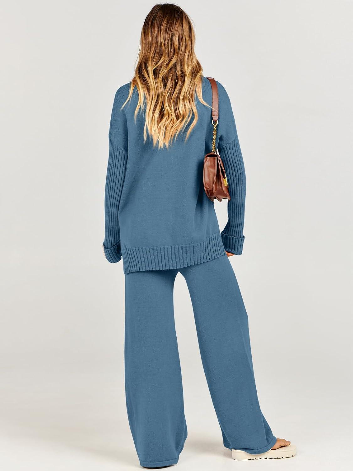 Caracilia Womens 2 Piece Sweater Set Knit Pullover Wide Leg Pants Lounge Matching Sets 2024 Fall Fashion Travel Outfits(Blue)