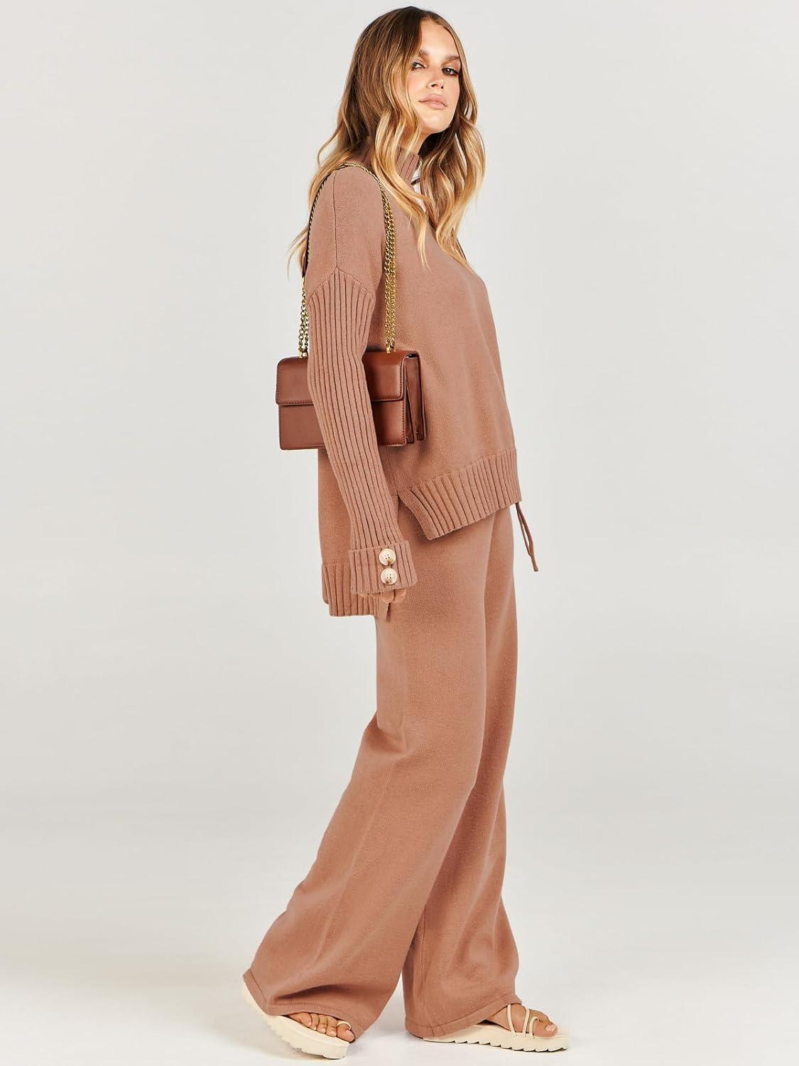 Caracilia Womens 2 Piece Sweater Set Knit Pullover Wide Leg Pants Lounge Matching Sets 2024 Fall Fashion Travel Outfits(Red Khaki)