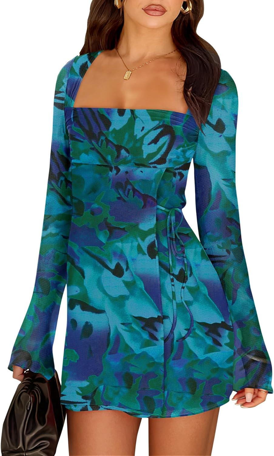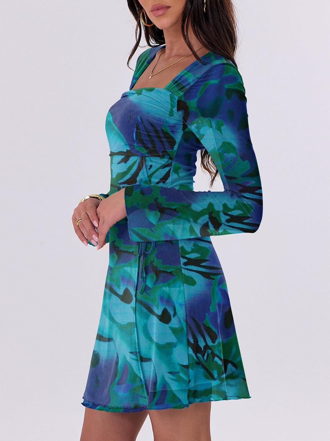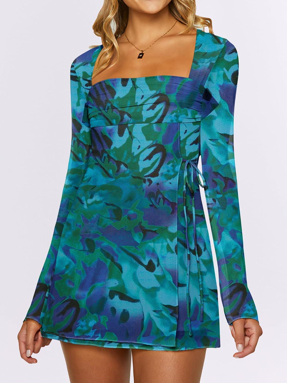 Caracilia Womens Sexy Mesh Ruched Mini Dresses Long Sleeve Square Neck Tie Fall Club Party Cocktail Short Dress 2025 Fashion(Floral Deep Blue)