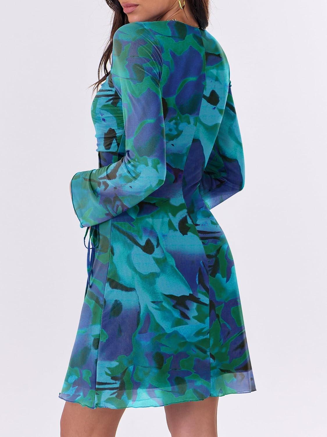Caracilia Womens Sexy Mesh Ruched Mini Dresses Long Sleeve Square Neck Tie Fall Club Party Cocktail Short Dress 2025 Fashion(Green Floral)