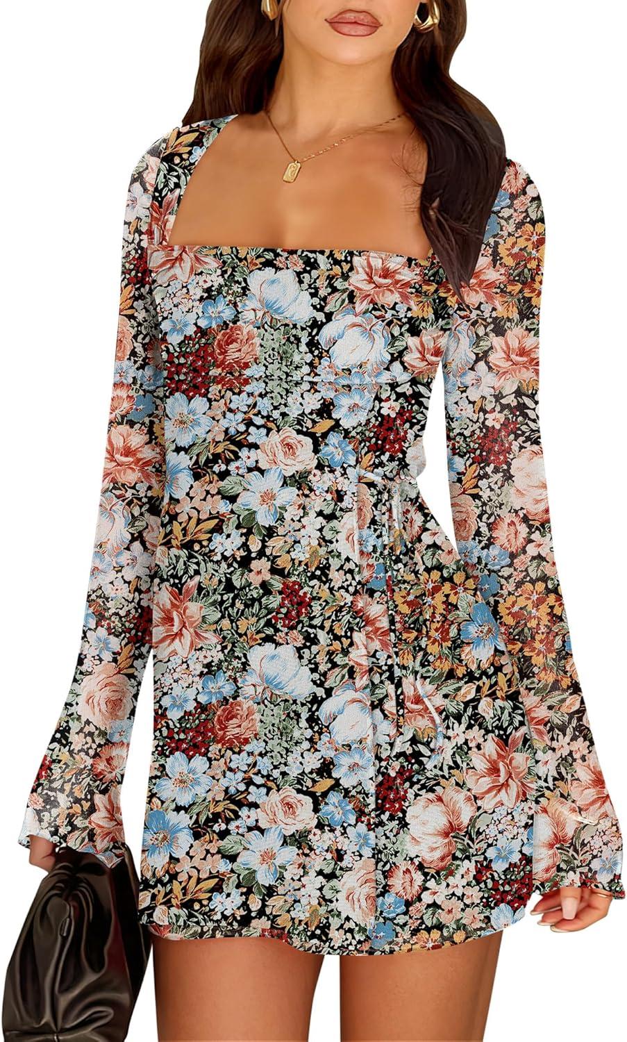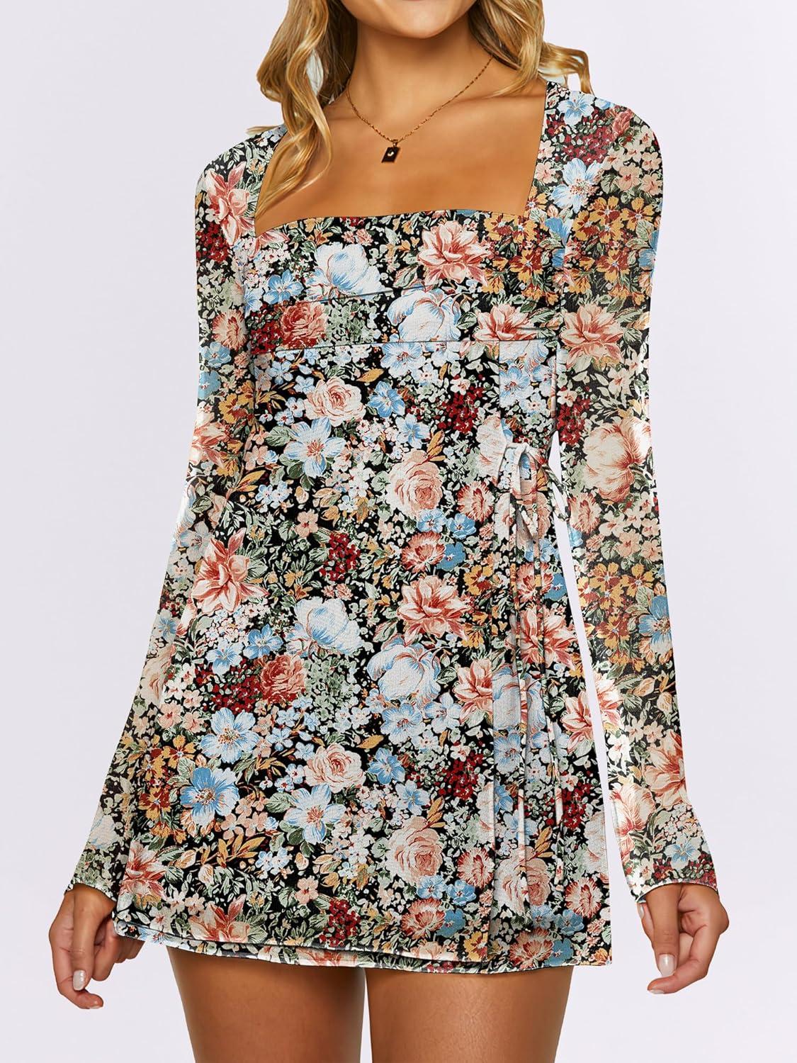 Caracilia Womens Sexy Mesh Ruched Mini Dresses Long Sleeve Square Neck Tie Fall Club Party Cocktail Short Dress 2025 Fashion(Multi Floral)
